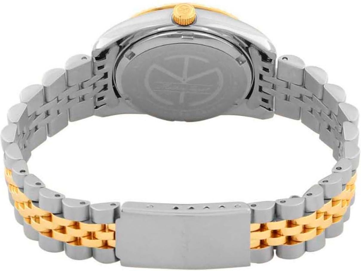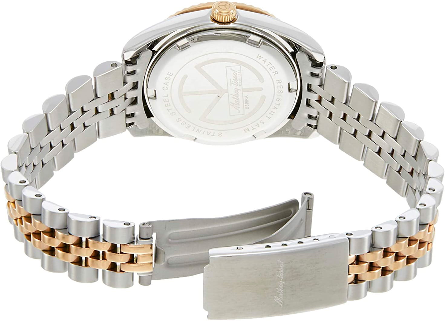 Женские кварцевые часы Mathey-Tissot Mathy D810BBU — это стильное сочетание элегантности и современного дизайна. Изящный корпус выполнен из нержавеющей стали, диаметром 32 мм, что придаст образу женственности и романтизма. Изысканный циферблат с метками в виде точек украшены кристаллами, что придает модели особый блеск. Циферблат защищен минеральным стекломМинеральное стеклоМинеральное стекло представляет собой искусственно выращенный минерал кварца. Такое стекло отличается особой устойчивостью к повреждениям и царапинам. Уступает по некоторым качествам сапфировому стеклу., обеспечивающий устойчивость к царапинам. Стрелки с люминесцентным покрытиемЛюминесцентное покрытиеПозволяет считывать показания времени в темноте. Производители наносят на стрелки, часовые индексы, безель или поверхность циферблата светонакопительный состав, дающий холодное свечение.. БезельБезельВнешний ободок, закрепляющий стекло. В спортивных часах так называется поворотное кольцо с делениями на циферблате, выполняет роль таймера – замеряет отрезки времени на шкале. Неподвижный безель – элемент декора. Однонаправленно вращающийся безель на дайверских часах позволяет фиксировать моменты погружения и выныривания на поверхность. с PVD-покрытиемPVDУльтратонкое покрытие наносится в технике вакуумного напыления, сочетает в себе нитрид титана особой прочности со слоем золота или оксида хрома. Несёт в себе декоративную или защитную функцию. золотистого цвета. Окошко даты находится в положении 3 часа. Часы оснащены надежным кварцевым механизмом. Стальной браслет с частичным PVD-покрытиемPVDУльтратонкое покрытие наносится в технике вакуумного напыления, сочетает в себе нитрид титана особой прочности со слоем золота или оксида хрома. Несёт в себе декоративную или защитную функцию. на раскладной застёжке с фиксаторомРаскладная застёжкаТакой тип застёжки используется только на браслетах из металла. Она никогда не раскрывается полностью, происходит разделение на 2 и более частей. Раскладывающая застёжка снизит вероятность потери часов к минимуму., гарантирует комфортное и безопасное ношение. Класс водозащиты: 50 метров позволит защитить корпус от случайных брызг или капель дождя. Mathey-Tissot  — отличный выбор для тех, кто ценит утонченность и качество.