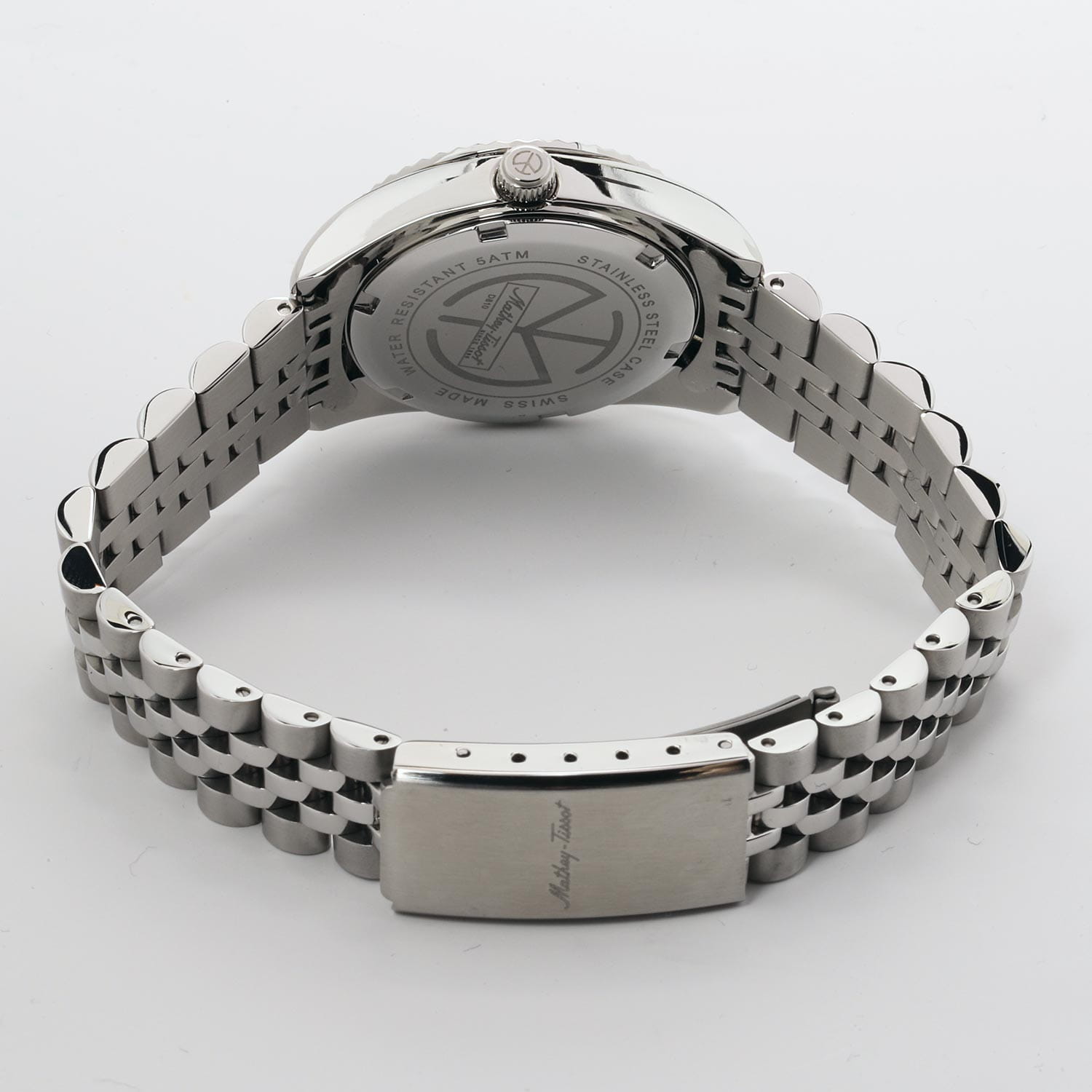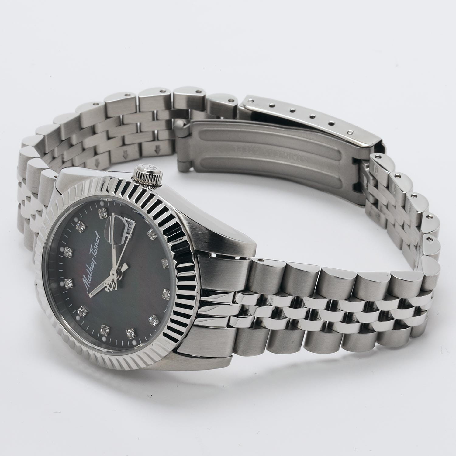 Женские кварцевые часы Mathey-Tissot Mathy D910AN — это стильное сочетание элегантности и современного дизайна. Изящный корпус выполнен из нержавеющей стали, диаметром 32 мм, что придаст образу женственности и романтизма. Изысканный циферблат с метками в виде точек украшены цирконами, что придает модели особый блеск. Циферблат защищен минеральным стекломМинеральное стеклоМинеральное стекло представляет собой искусственно выращенный минерал кварца. Такое стекло отличается особой устойчивостью к повреждениям и царапинам. Уступает по некоторым качествам сапфировому стеклу., обеспечивающий устойчивость к царапинам. Стрелки с люминесцентным покрытиемЛюминесцентное покрытиеПозволяет считывать показания времени в темноте. Производители наносят на стрелки, часовые индексы, безель или поверхность циферблата светонакопительный состав, дающий холодное свечение.. Окошко даты находится в положении 3 часа. Часы оснащены надежным кварцевым механизмом. Стальной браслет на раскладной застёжкеРаскладная застёжкаТакой тип застёжки используется только на браслетах из металла. Она никогда не раскрывается полностью, происходит разделение на 2 и более частей. Раскладывающая застёжка снизит вероятность потери часов к минимуму., гарантирует комфортное и безопасное ношение. Класс водозащиты: 50 метров позволит защитить корпус от случайных брызг или капель дождя. Mathey-Tissot — отличный выбор для тех, кто ценит утонченность и качество.