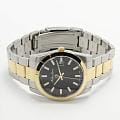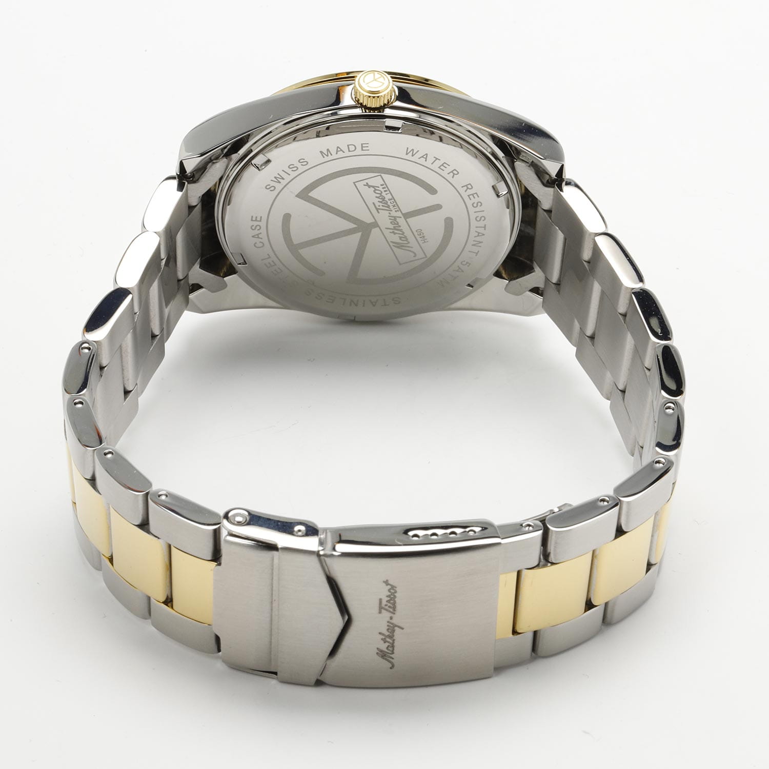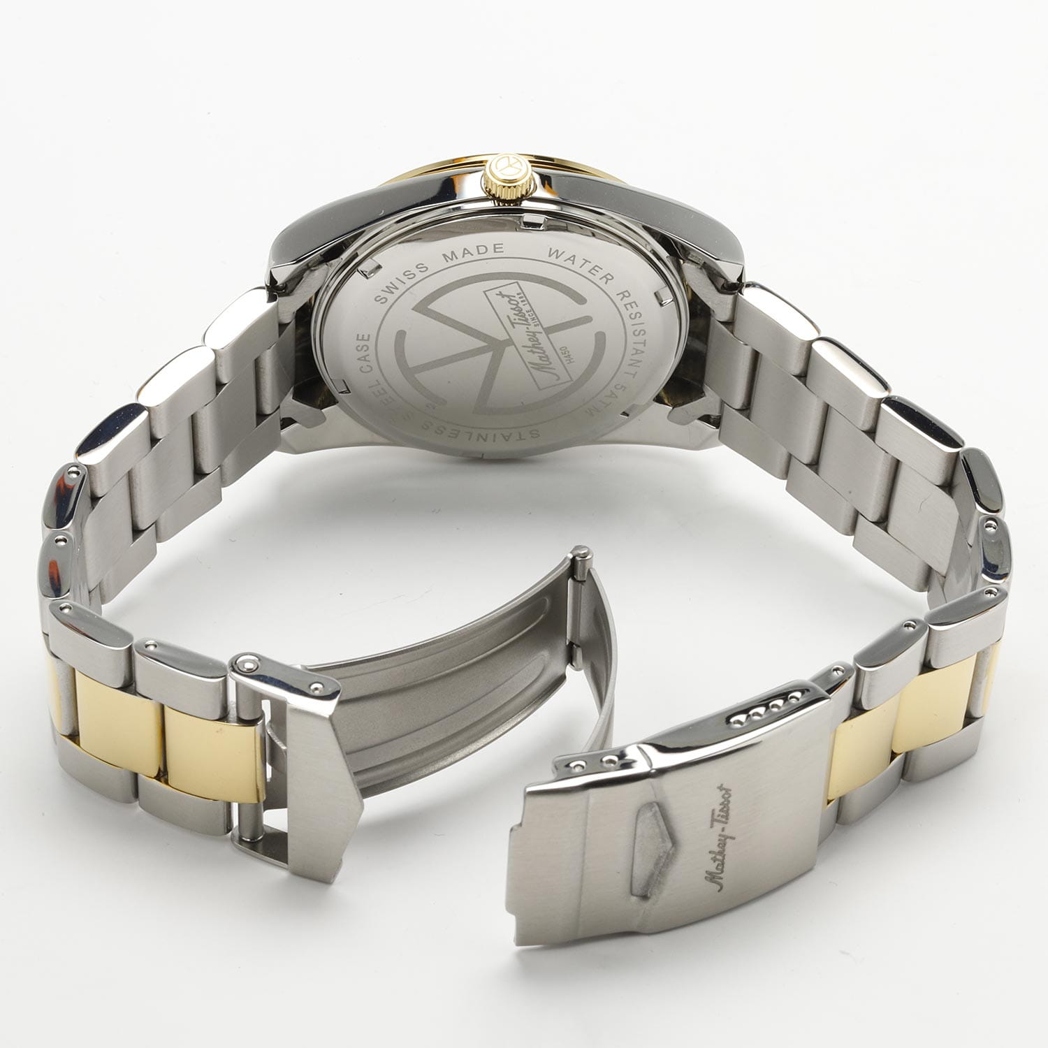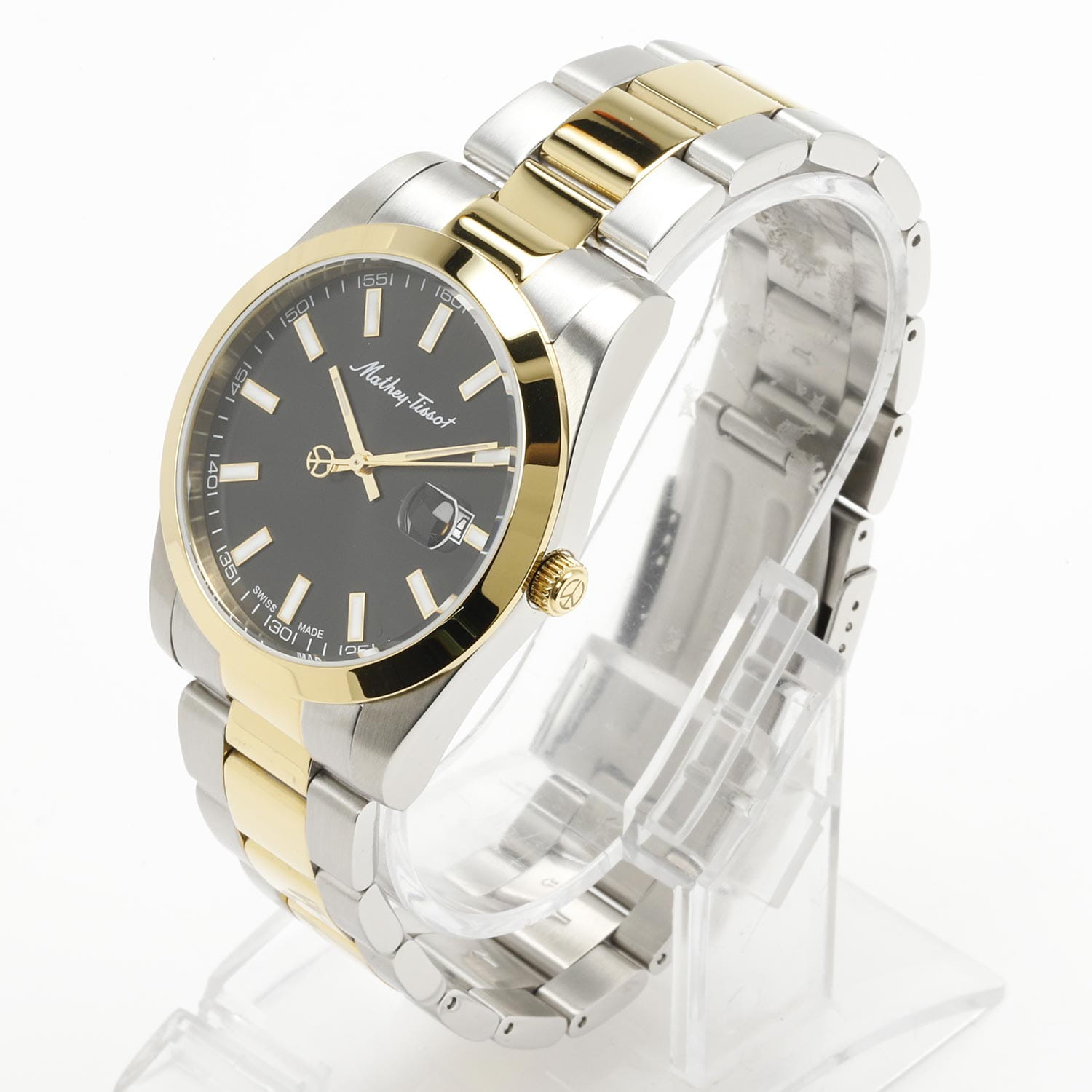 Мужские кварцевые часы Mathey-Tissot Mathy H450BN — это стильное сочетание элегантности и современного дизайна. Изящный корпус выполнен из нержавеющей стали, диаметром 40 мм, что придаст образу элегантности и надежности. Изысканный циферблат с метками в виде штрихов придает модели особый блеск. Циферблат защищен минеральным стекломМинеральное стеклоМинеральное стекло представляет собой искусственно выращенный минерал кварца. Такое стекло отличается особой устойчивостью к повреждениям и царапинам. Уступает по некоторым качествам сапфировому стеклу., обеспечивает устойчивость к царапинам. Стрелки и метки с люминесцентным покрытиемЛюминесцентное покрытиеПозволяет считывать показания времени в темноте. Производители наносят на стрелки, часовые индексы, безель или поверхность циферблата светонакопительный состав, дающий холодное свечение.. БезельБезельВнешний ободок, закрепляющий стекло. В спортивных часах так называется поворотное кольцо с делениями на циферблате, выполняет роль таймера – замеряет отрезки времени на шкале. Неподвижный безель – элемент декора. Однонаправленно вращающийся безель на дайверских часах позволяет фиксировать моменты погружения и выныривания на поверхность. с PVD-покрытиемPVDУльтратонкое покрытие наносится в технике вакуумного напыления, сочетает в себе нитрид титана особой прочности со слоем золота или оксида хрома. Несёт в себе декоративную или защитную функцию. золотистого цвета. Окошко даты находится в положении 3 часа. Часы оснащены надежным кварцевым механизмом. Стальной браслет с частичным PVD-покрытиемPVDУльтратонкое покрытие наносится в технике вакуумного напыления, сочетает в себе нитрид титана особой прочности со слоем золота или оксида хрома. Несёт в себе декоративную или защитную функцию. на раскладной застёжке с фиксаторомРаскладная застёжкаТакой тип застёжки используется только на браслетах из металла. Она никогда не раскрывается полностью, происходит разделение на 2 и более частей. Раскладывающая застёжка снизит вероятность потери часов к минимуму., гарантирует комфортное и безопасное ношение. Рифленая заводная головка. Класс водозащиты: 50 метров позволит защитить корпус от случайных брызг или капель дождя. Mathey-Tissot  — отличный выбор для тех, кто ценит утонченность и качество.
