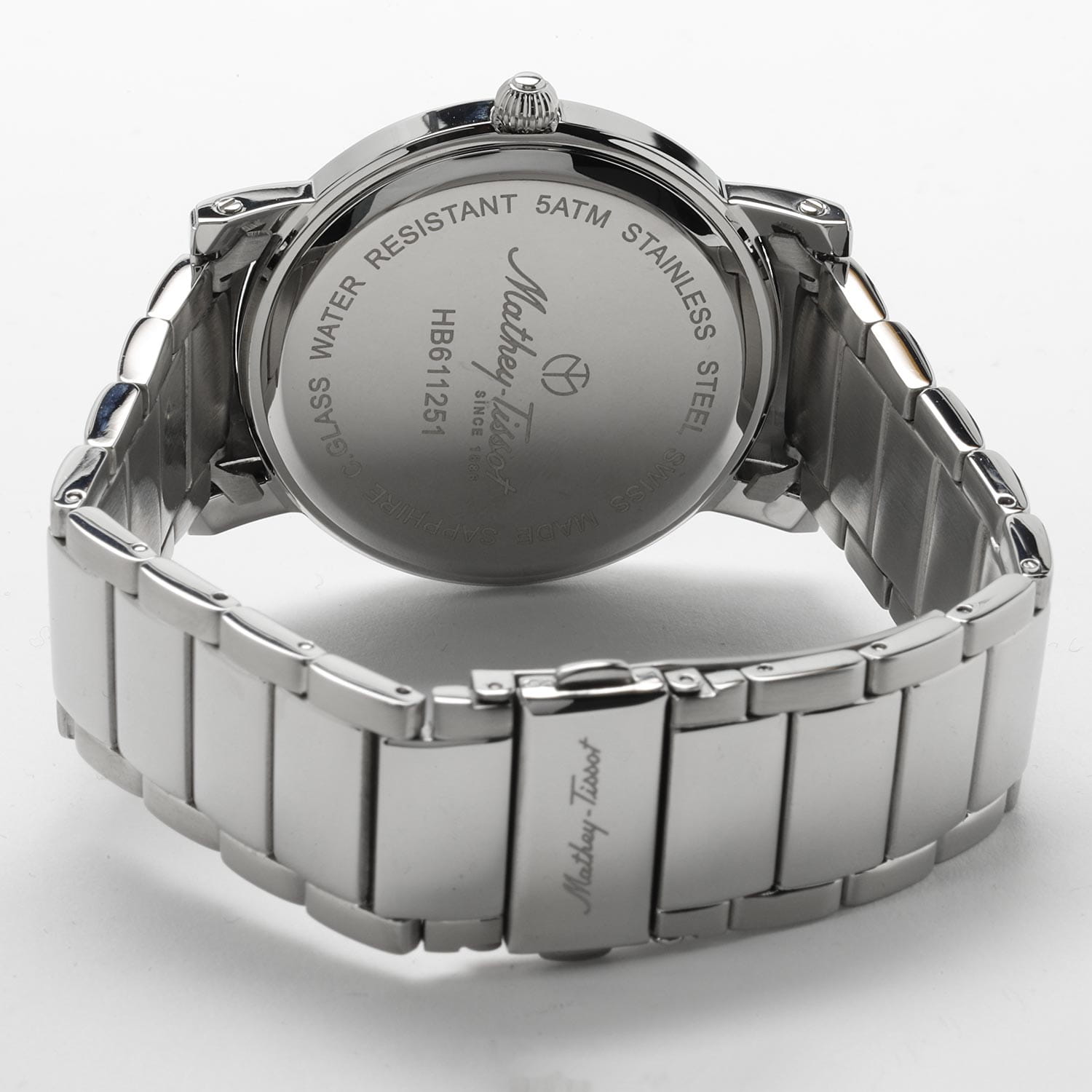 Мужские кварцевые часы Mathey-Tissot City Metal HB611251MAN — это стильное сочетание элегантности и современного дизайна. Изящный корпус выполнен из нержавеющей стали 316L серебристого цвета, диаметром 42 мм, что придаст образу элегантности и надежности. Изысканный циферблат с метками в виде штрихов придает модели особый блеск. Циферблат защищен минеральным стекломМинеральное стеклоМинеральное стекло представляет собой искусственно выращенный минерал кварца. Такое стекло отличается особой устойчивостью к повреждениям и царапинам. Уступает по некоторым качествам сапфировому стеклу. с сапфировым покрытием, обеспечивающий устойчивость к царапинам. Окошко даты находится в положении 3 часа. Часы оснащены надежным кварцевым механизмом. Стальной браслет на раскладной застёжкеРаскладная застёжкаТакой тип застёжки используется только на браслетах из металла. Она никогда не раскрывается полностью, происходит разделение на 2 и более частей. Раскладывающая застёжка снизит вероятность потери часов к минимуму., гарантирует комфортное и безопасное ношение. Класс водозащиты: 30 метров позволит защитить корпус от случайных брызг или капель дождя. Mathey-Tissot  — отличный выбор для тех, кто ценит утонченность и качество.