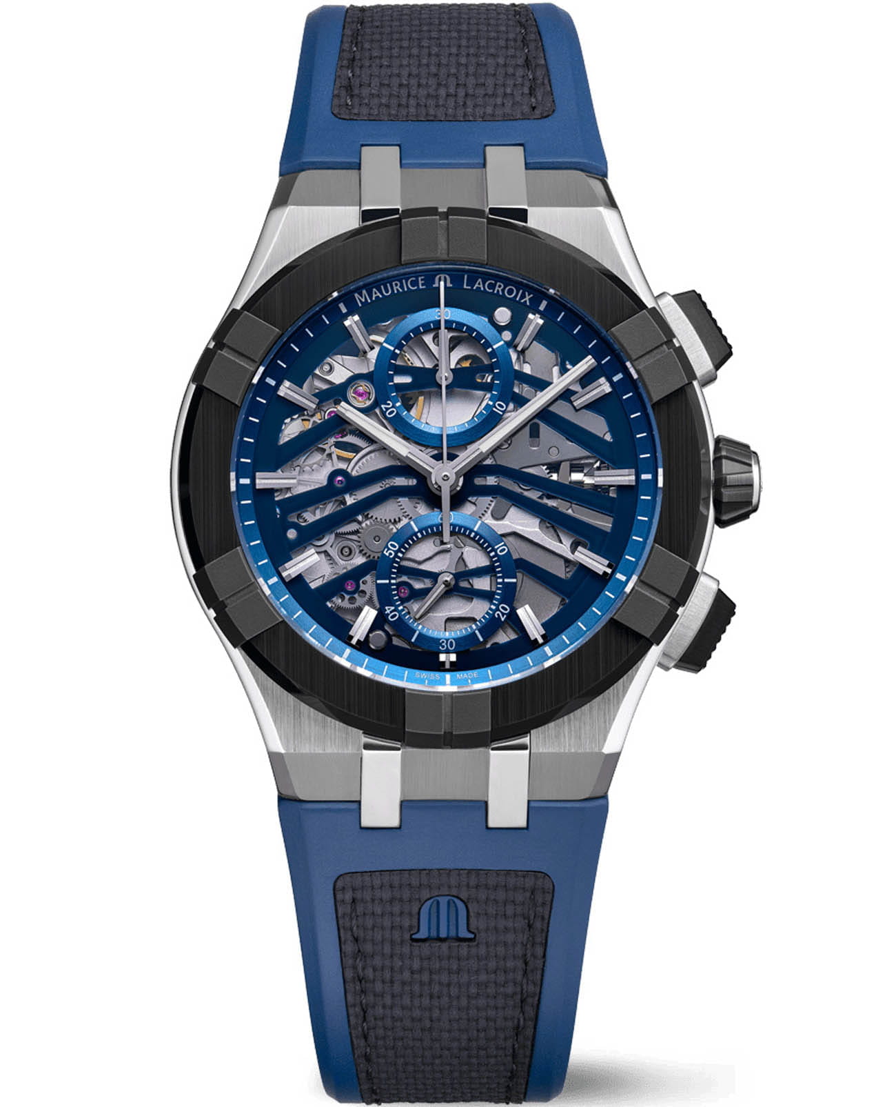 Швейцарские часы Maurice Lacroix Aikonic Automatic Chronograph Skeleton AC8018-SSL20-030-4, воплощающие современный стиль и безупречное швейцарское качество. Корпус из нержавеющей стали диаметром 43 мм c неподвижным безелемБезельВнешний ободок, закрепляющий стекло. В спортивных часах так называется поворотное кольцо с делениями на циферблате, выполняет роль таймера – замеряет отрезки времени на шкале. Неподвижный безель – элемент декора. Однонаправленно вращающийся безель на дайверских часах позволяет фиксировать моменты погружения и выныривания на поверхность. из стали и керамики и совмещает матовую и полированную отделку, придавая часам изысканный вид. Сапфировое стеклоСапфировое стеклоПрочный и надёжный материал из кристалла сапфира синтетического происхождения, характеризующийся особой твёрдостью и устойчивостью к царапинам и повреждениям. с двойным антибликовым покрытиемАнтибликовое покрытиеСлой оксида металла в 0,13-0,3 микрон, благодаря которому стекло часов не бликует и не отражает свет. Антибликовое покрытие уменьшает отражение света в 10 раз, обеспечивая отличную читаемость показателей циферблата. надежно защищает скелетонизированный циферблат, через который можно увидеть весь механизм. Завинчивающаяся заводная головка подчеркивают уверенный характер модели. Часы водонепроницаемы до 10 ATM, что делает их отличным выбором для активного образа жизни. Циферблат с изысканными лаконичными стрелками и метками, а также с индикаторами хронографаХронографФункция позволяет измерять отрезки времени с особой точностью: часы, минуты, секунды. Верным признаком хронографа является наличие на циферблате 3 дополнительных окошек-счётчиков.. Стрелки и метки с люминесцентным покрытиемЛюминесцентное покрытиеПозволяет считывать показания времени в темноте. Производители наносят на стрелки, часовые индексы, безель или поверхность циферблата светонакопительный состав, дающий холодное свечение., что облегчает чтение времени даже в условиях слабого освещения. Часы комплектуются ремешком из каучука со стандартной застежкой, обеспечивая удобство и стиль.