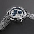 Модель оснащена кварцевым механизмом с хронографомХронографФункция позволяет измерять отрезки времени с особой точностью: часы, минуты, секунды. Верным признаком хронографа является наличие на циферблате 3 дополнительных окошек-счётчиков., включающим центральную секундную стрелку, 30-минутный счётчик на «9 часах» и 1/10-секундный счётчик на «12 часах». Функционал дополнен индикацией даты в положении «6 часов».