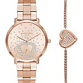 Женские американские часы Michael Kors Jaryn MK3621, кварцевый механизм с высокой точностью. Минеральное стеклоМинеральное стеклоМинеральное стекло представляет собой искусственно выращенный минерал кварца. Такое стекло отличается особой устойчивостью к повреждениям и царапинам. Уступает по некоторым качествам сапфировому стеклу., устойчивое к мелким механическим повреждениям. Корпус часов выполнен из нержавеющей стали с PVD-покрытиемPVDУльтратонкое покрытие наносится в технике вакуумного напыления, сочетает в себе нитрид титана особой прочности со слоем золота или оксида хрома. Несёт в себе декоративную или защитную функцию.. Циферблат украшен кристаллами. Класс водозащиты: 50 метров, позволит защитить корпус от случайных брызг или капель дождя. Стальной браслет с PVD-покрытиемPVDУльтратонкое покрытие наносится в технике вакуумного напыления, сочетает в себе нитрид титана особой прочности со слоем золота или оксида хрома. Несёт в себе декоративную или защитную функцию. на раскладной застёжкеРаскладная застёжкаТакой тип застёжки используется только на браслетах из металла. Она никогда не раскрывается полностью, происходит разделение на 2 и более частей. Раскладывающая застёжка снизит вероятность потери часов к минимуму..