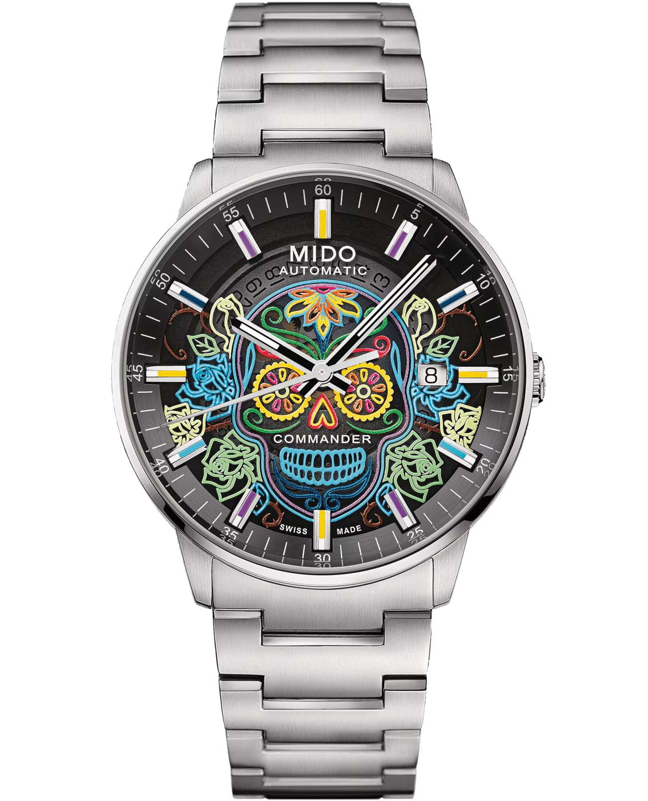 Мужские швейцарские механические часы Mido Commander Gradient Catrines M021.407.11.411.04, механический механизм (автоматический калибр) с высокой точностью. Сапфировое стеклоСапфировое стеклоПрочный и надёжный материал из кристалла сапфира синтетического происхождения, характеризующийся особой твёрдостью и устойчивостью к царапинам и повреждениям. устойчивое к появлению царапин, обладающее высокой прозрачностью. Корпус часов изготовлен из нержавеющей стали серебристого цвета. Лаконичные стрелки и метки с люминесцентным покрытиемЛюминесцентное покрытиеПозволяет считывать показания времени в темноте. Производители наносят на стрелки, часовые индексы, безель или поверхность циферблата светонакопительный состав, дающий холодное свечение. SuperLumiNova® обеспечивают превосходную читаемость даже в условиях низкой освещённости. Окошко даты в положении 3 часов. Класс водозащиты: 50 метров, позволит защитить корпус от случайных брызг или капель дождя. Часы со спиралью баланса Nivachron™Nivachron™Специально разработанный инновационный сплав Nivachron™ повышает устойчивость часов к воздействию магнитных полей.. Изысканный стальной браслет на раскладной застёжкеРаскладная застёжкаТакой тип застёжки используется только на браслетах из металла. Она никогда не раскрывается полностью, происходит разделение на 2 и более частей. Раскладывающая застёжка снизит вероятность потери часов к минимуму.. В комплекте к часам идут два дополнительных ремешка. Mido Commander — это выбор для тех, кто ценит утончённость, стиль и высочайшее качество.