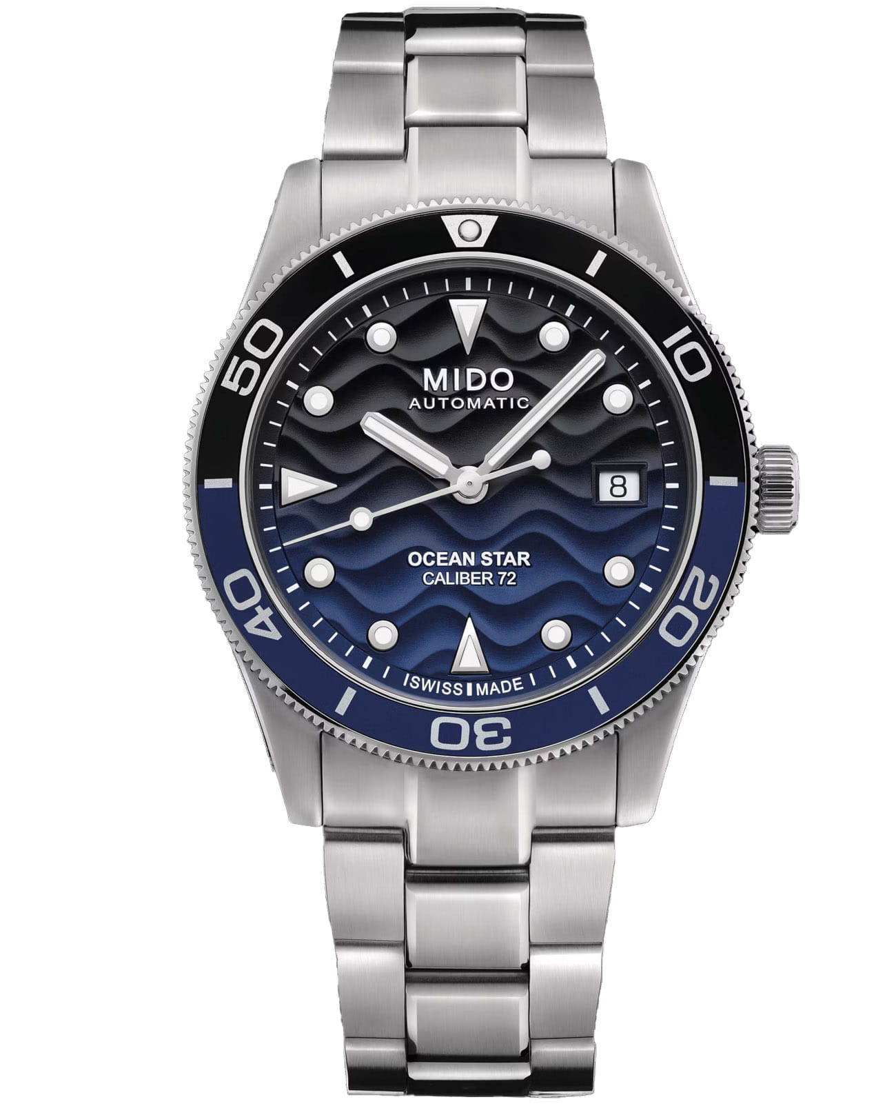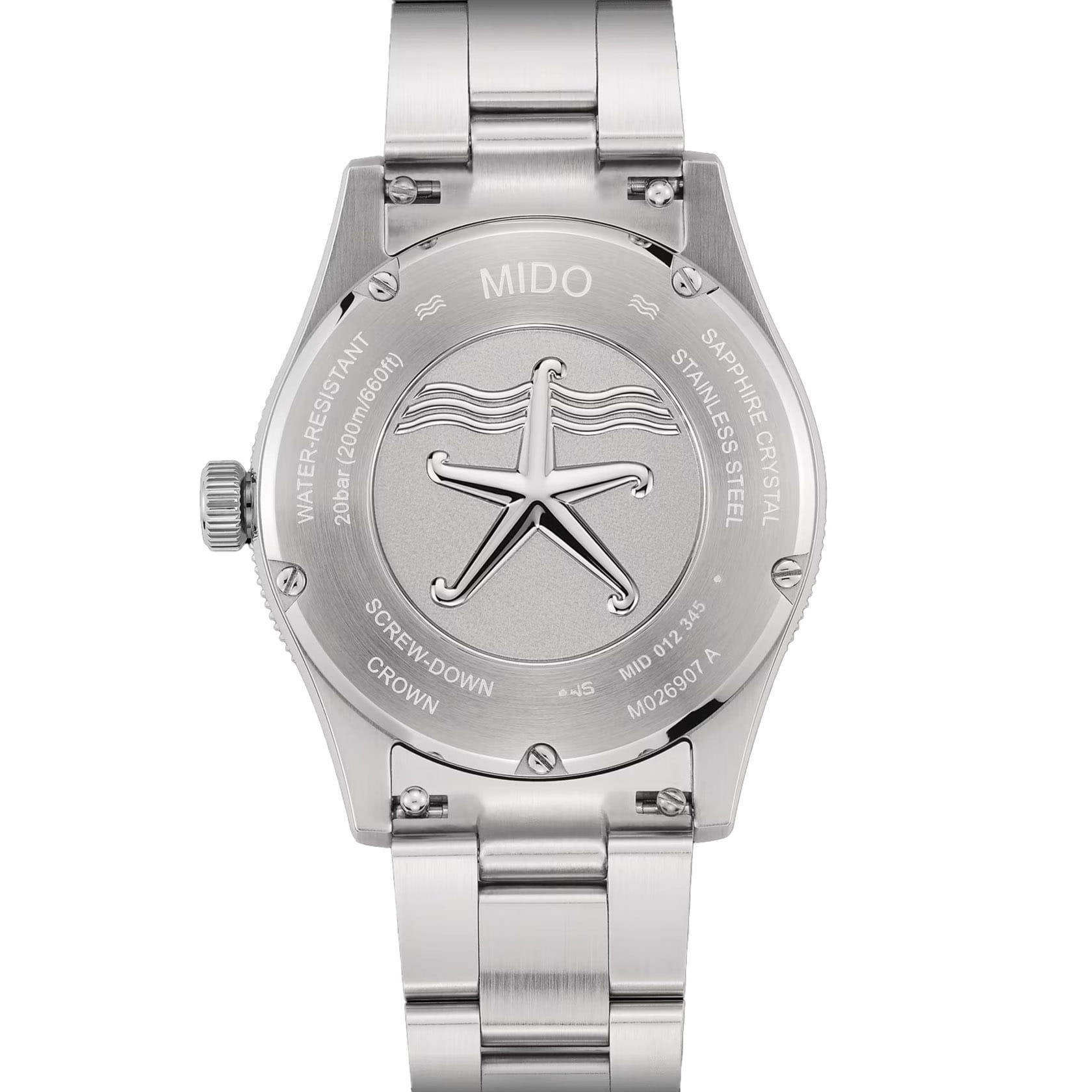 Мужские швейцарские механические часы с сапфировым стеклом Mido Ocean Star 39 M026.907.11.041.00, механический механизм (автоматический калибр) с высокой точностью. Сапфировое стеклоСапфировое стеклоПрочный и надёжный материал из кристалла сапфира синтетического происхождения, характеризующийся особой твёрдостью и устойчивостью к царапинам и повреждениям. устойчивое к появлению царапин, обладающее высокой прозрачностью. Корпус часов изготовлен из нержавеющей стали. Вращающийся безельБезельВнешний ободок, закрепляющий стекло. В спортивных часах так называется поворотное кольцо с делениями на циферблате, выполняет роль таймера – замеряет отрезки времени на шкале. Неподвижный безель – элемент декора. Однонаправленно вращающийся безель на дайверских часах позволяет фиксировать моменты погружения и выныривания на поверхность. из нержавеющей стали с PVDPVDУльтратонкое покрытие наносится в технике вакуумного напыления, сочетает в себе нитрид титана особой прочности со слоем золота или оксида хрома. Несёт в себе декоративную или защитную функцию. покрытием и керамики с покрытием Superluminova. Циферблат украшают метки с бриллиантами. Стрелки и метки с люминесцентным покрытиемЛюминесцентное покрытиеПозволяет считывать показания времени в темноте. Производители наносят на стрелки, часовые индексы, безель или поверхность циферблата светонакопительный состав, дающий холодное свечение.. Окошко даты в положении 3 часов. Класс водозащиты: 200 метров, позволит плавать, нырять и заниматься другими водными видами спорта.