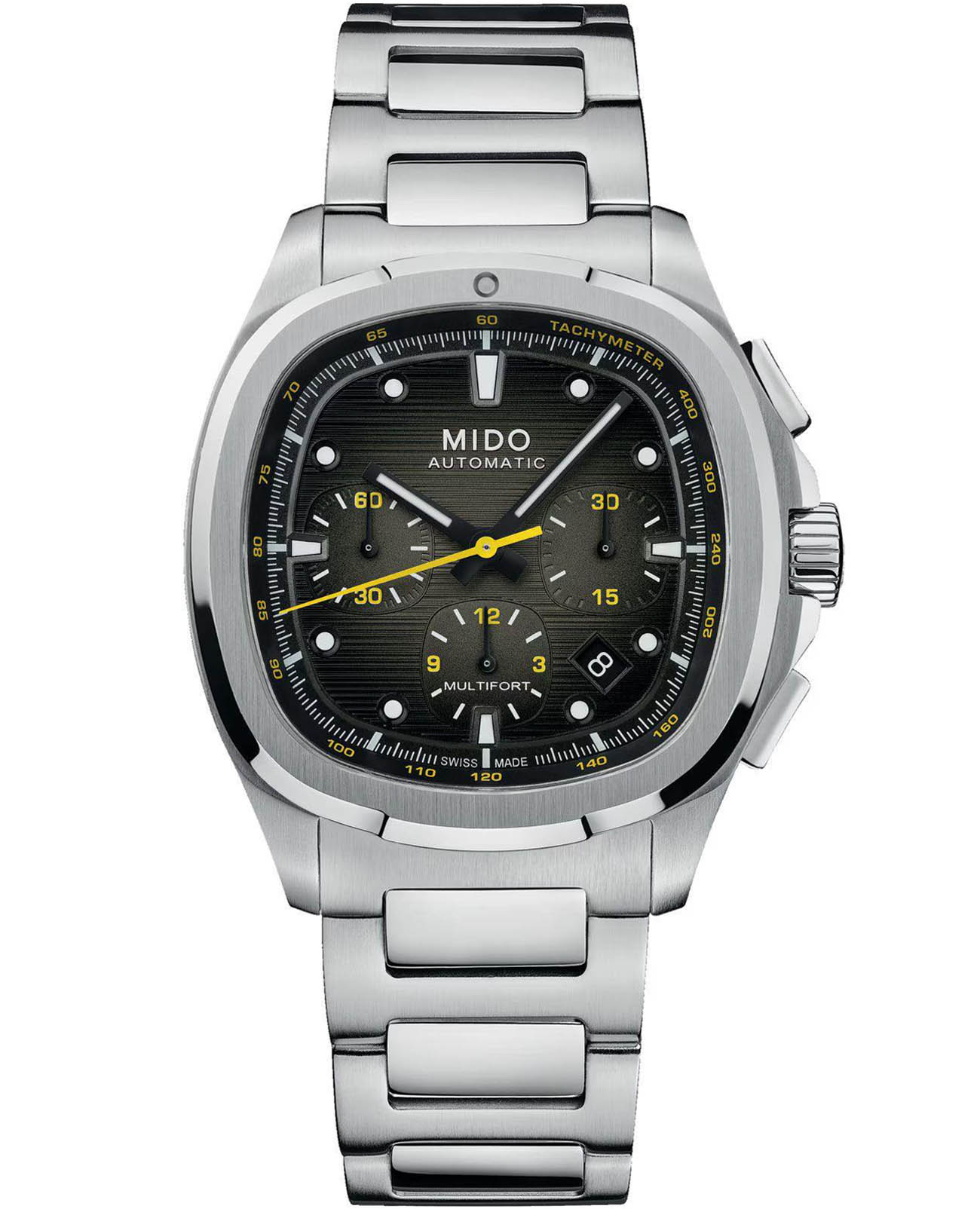 Мужские механические швейцарские часы Mido Multifort TV Chronograph M049.527.11.081.00, механический механизм с высокой точностью. Сапфировое стеклоСапфировое стеклоПрочный и надёжный материал из кристалла сапфира синтетического происхождения, характеризующийся особой твёрдостью и устойчивостью к царапинам и повреждениям. устойчивое к появлению царапин, обладающее высокой прозрачностью. Корпус часов изготовлен из нержавеющей стали. В механизм внедрена пружина баланса Nivachron™Nivachron™Специально разработанный инновационный сплав Nivachron™ повышает устойчивость часов к воздействию магнитных полей.. Стрелки с люминесцентным покрытиемЛюминесцентное покрытиеПозволяет считывать показания времени в темноте. Производители наносят на стрелки, часовые индексы, безель или поверхность циферблата светонакопительный состав, дающий холодное свечение.. Окошко даты в положении между 4 и 6 часами. Класс водозащиты: 100 метров, позволит плавать, нырять и заниматься другими водными видами спорта. Стальной браслет на раскладной застёжкеРаскладная застёжкаТакой тип застёжки используется только на браслетах из металла. Она никогда не раскрывается полностью, происходит разделение на 2 и более частей. Раскладывающая застёжка снизит вероятность потери часов к минимуму.. Часы с функциями хронографаХронографФункция позволяет измерять отрезки времени с особой точностью: часы, минуты, секунды. Верным признаком хронографа является наличие на циферблате 3 дополнительных окошек-счётчиков. и тахиметраТахиметрРазмеченная шкала, располагается на ободке или безеле часов. Тахиметр позволяет рассчитать скорость на определённом участке пути, расстояние измеряется в километрах или милях..Поставляются с дополнительным ремешком, что обеспечивает еще большую универсальность и комфорт.