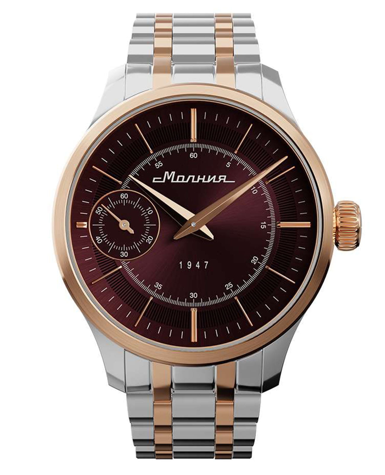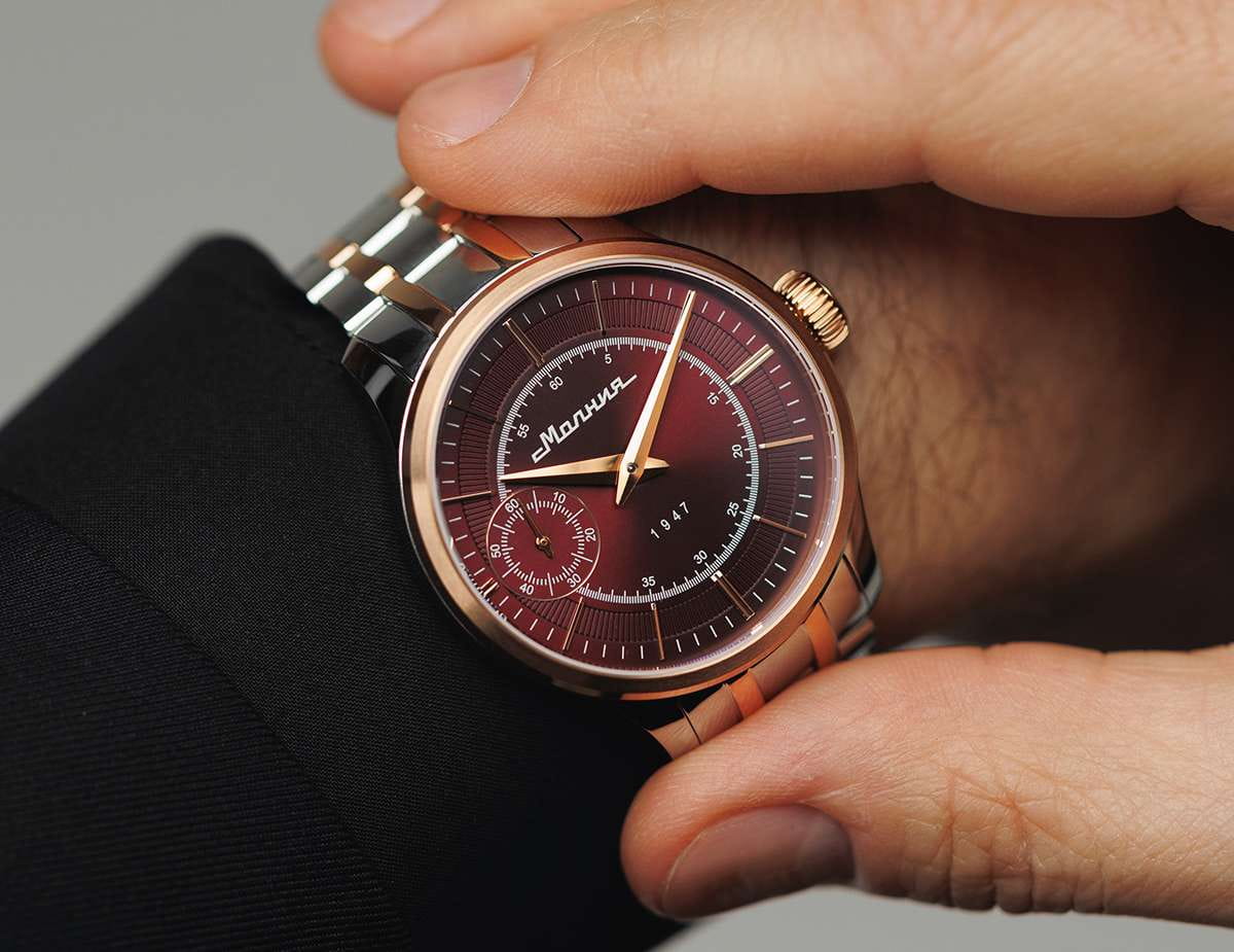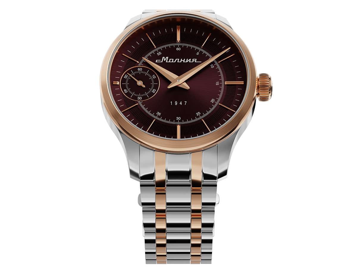 Мужские механические часы с ручным подзаводом — это аксессуар от легендарного бренда «МОЛНИЯ», созданный на Челябинском часовом заводе. Корпус диаметром 41 мм выполнен из нержавеющей стали 316L. БезельБезельВнешний ободок, закрепляющий стекло. В спортивных часах так называется поворотное кольцо с делениями на циферблате, выполняет роль таймера – замеряет отрезки времени на шкале. Неподвижный безель – элемент декора. Однонаправленно вращающийся безель на дайверских часах позволяет фиксировать моменты погружения и выныривания на поверхность. выполнен из стали с PVD-покрытиемPVDУльтратонкое покрытие наносится в технике вакуумного напыления, сочетает в себе нитрид титана особой прочности со слоем золота или оксида хрома. Несёт в себе декоративную или защитную функцию. и зеркальной отделкой. Циферблат красного цвета оформлен индексами и стрелками. Малая секундная стрелка вынесена на позицию 9 часов. Циферблат защищён сапфировым стекломСапфировое стеклоПрочный и надёжный материал из кристалла сапфира синтетического происхождения, характеризующийся особой твёрдостью и устойчивостью к царапинам и повреждениям. толщиной 2 мм. Механизм — мануфактурный калибр 3603, собранный вручную, с запасом хода до 40 часов. Прозрачная задняя крышка позволяет наблюдать за работой механизма. Часы оснащены стальным браслетом с частичным PVD-покрытиемPVDУльтратонкое покрытие наносится в технике вакуумного напыления, сочетает в себе нитрид титана особой прочности со слоем золота или оксида хрома. Несёт в себе декоративную или защитную функцию. под золото и системой быстрой замены на раскладной застёжкеРаскладная застёжкаТакой тип застёжки используется только на браслетах из металла. Она никогда не раскрывается полностью, происходит разделение на 2 и более частей. Раскладывающая застёжка снизит вероятность потери часов к минимуму. типа клипса. Водонепроницаемость 50 м позволяет использовать часы в повседневных условиях. Идеальный выбор для тех, кто ценит российское качество и традиции.