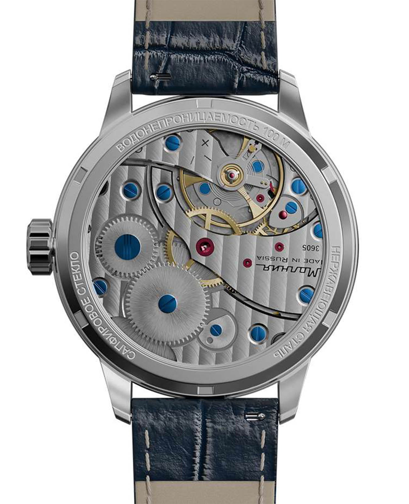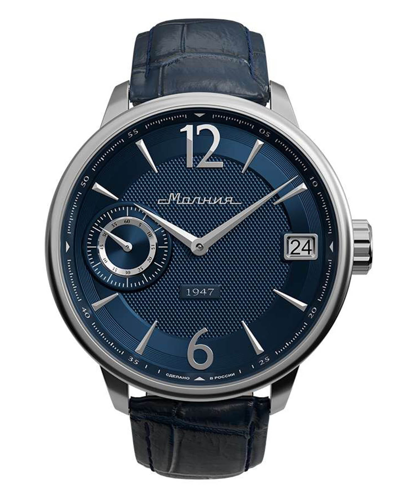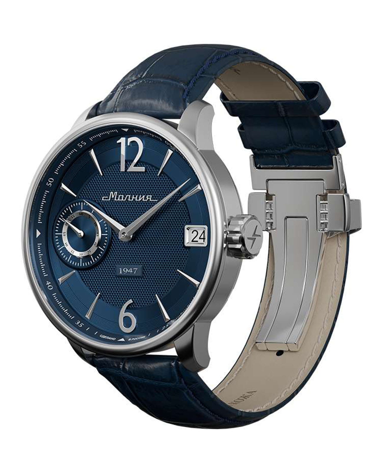 Мужские механические часы с ручным подзаводом — это аксессуар от легендарного бренда «МОЛНИЯ», созданный на Челябинском часовом заводе. Корпус диаметром 41 мм выполнен из нержавеющей стали 316L с зеркальной полировкой. Циферблат синего цвета оформлен арабскими цифрами и стальными индексами. Малая секундная стрелка вынесена на позицию 9 часов, окошко даты расположено в положении 3 часов. Циферблат защищён сапфировым стекломСапфировое стеклоПрочный и надёжный материал из кристалла сапфира синтетического происхождения, характеризующийся особой твёрдостью и устойчивостью к царапинам и повреждениям.. Механизм — мануфактурный калибр 3605, собранный вручную, с запасом хода до 40 часов. Прозрачная задняя крышка позволяет наблюдать за работой механизма. Часы оснащены кожаным ремешком синего цвета с раскладной застёжкойРаскладная застёжкаТакой тип застёжки используется только на браслетах из металла. Она никогда не раскрывается полностью, происходит разделение на 2 и более частей. Раскладывающая застёжка снизит вероятность потери часов к минимуму. и системой быстрой замены. Водонепроницаемость 100 м позволяет использовать часы для плавания и повседневного ношения. Идеальный выбор для тех, кто ценит российское качество и традиции.
