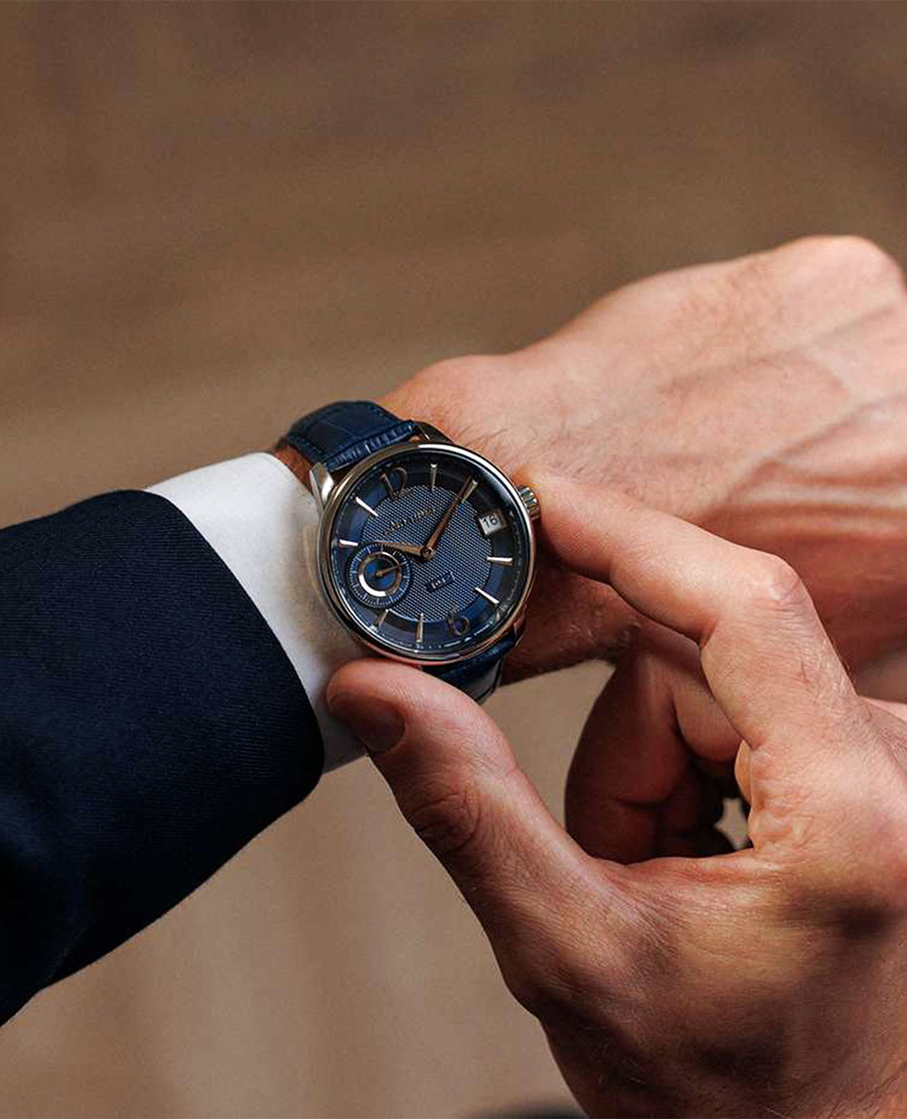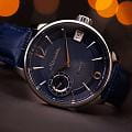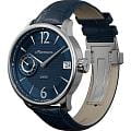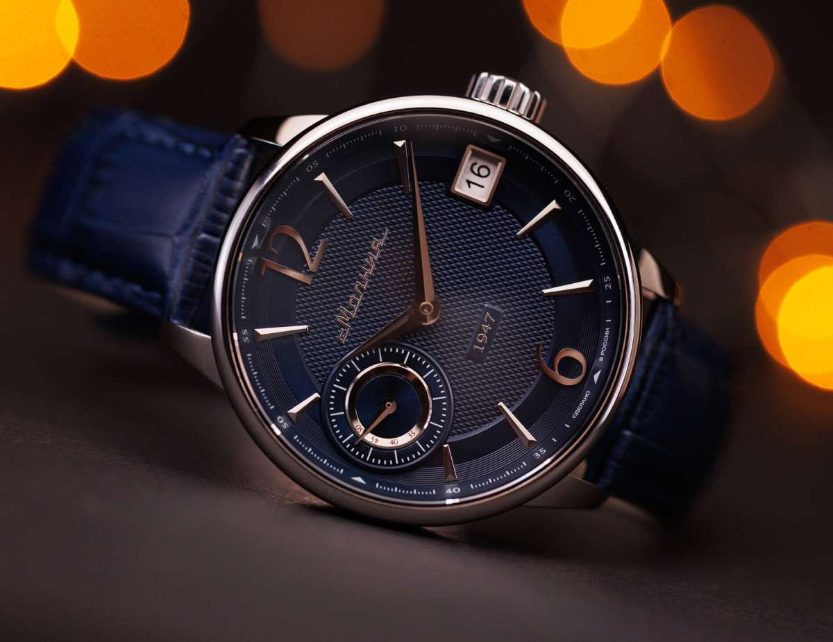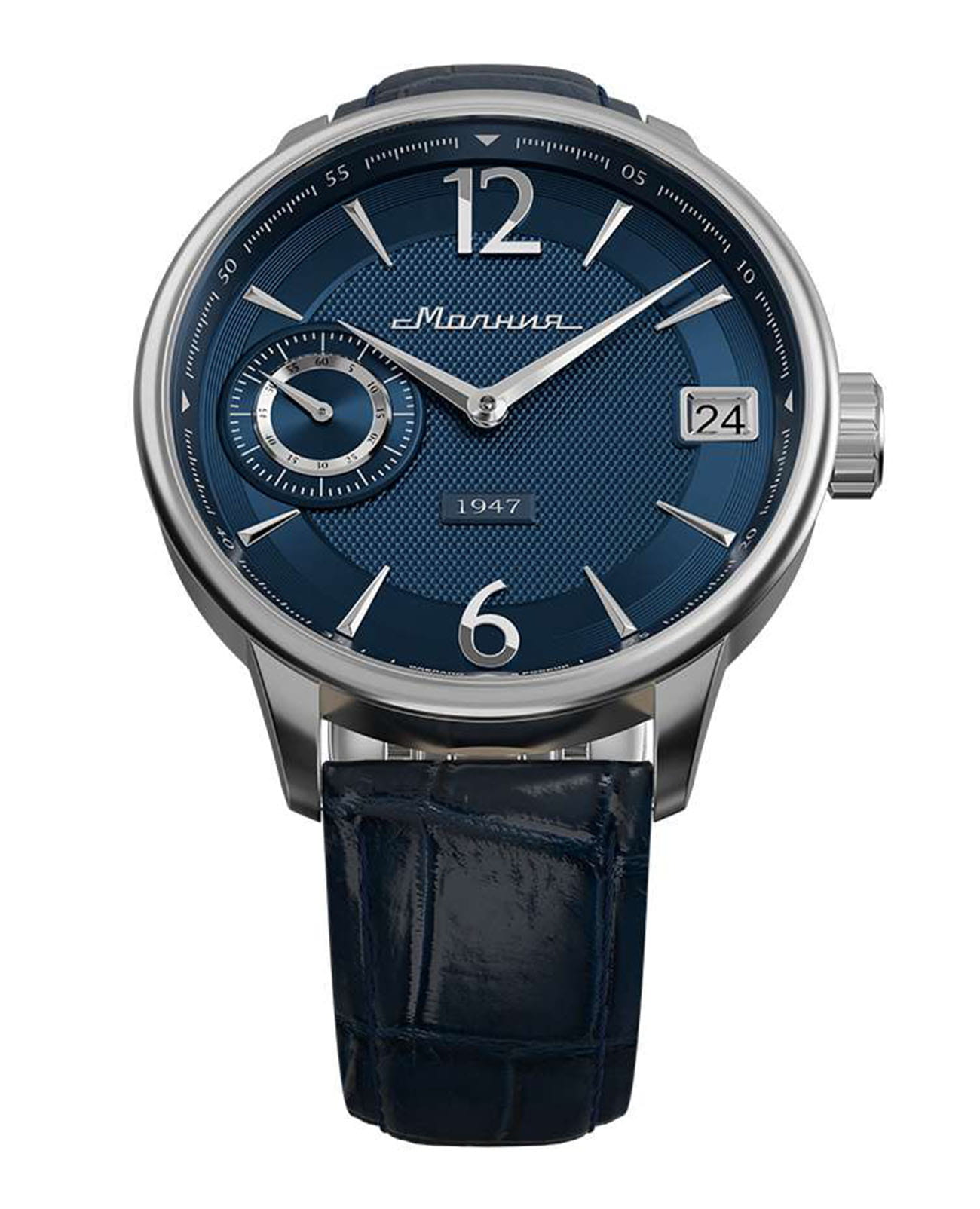 Мужские механические часы с ручным подзаводом — это аксессуар от легендарного бренда «МОЛНИЯ», созданный на Челябинском часовом заводе. Корпус диаметром 41 мм выполнен из нержавеющей стали 316L с зеркальной полировкой. Циферблат синего цвета оформлен арабскими цифрами и стальными индексами. Малая секундная стрелка вынесена на позицию 9 часов, окошко даты расположено в положении 3 часов. Циферблат защищён сапфировым стекломСапфировое стеклоПрочный и надёжный материал из кристалла сапфира синтетического происхождения, характеризующийся особой твёрдостью и устойчивостью к царапинам и повреждениям.. Механизм — мануфактурный калибр 3605, собранный вручную, с запасом хода до 40 часов. Прозрачная задняя крышка позволяет наблюдать за работой механизма. Часы оснащены кожаным ремешком синего цвета с раскладной застёжкойРаскладная застёжкаТакой тип застёжки используется только на браслетах из металла. Она никогда не раскрывается полностью, происходит разделение на 2 и более частей. Раскладывающая застёжка снизит вероятность потери часов к минимуму. и системой быстрой замены. Водонепроницаемость 100 м позволяет использовать часы для плавания и повседневного ношения. Идеальный выбор для тех, кто ценит российское качество и традиции.
