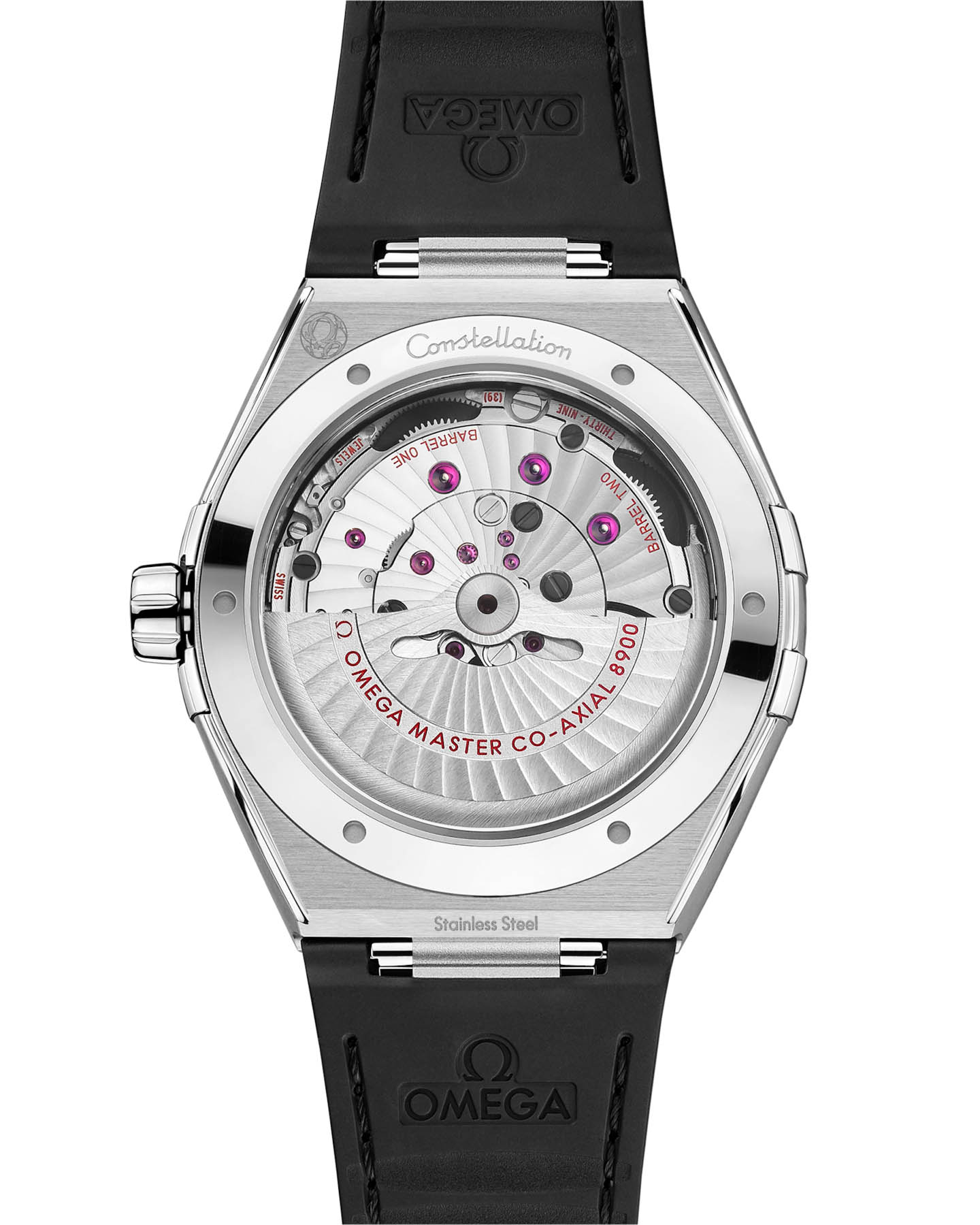 Драматичный и неизменный дизайн OMEGA Constellation характеризуется знаменитыми полумесяцами, а также «скобами» на боковой стороне корпуса. Модель из нержавеющей стали диаметром 41 мм оснащена цветными римскими цифрами на безелеБезельВнешний ободок, закрепляющий стекло. В спортивных часах так называется поворотное кольцо с делениями на циферблате, выполняет роль таймера – замеряет отрезки времени на шкале. Неподвижный безель – элемент декора. Однонаправленно вращающийся безель на дайверских часах позволяет фиксировать моменты погружения и выныривания на поверхность., циферблатом с шелковым тиснением серо-родиевого цвета и окошком даты в положении «6 часов». Стрелки, логотип OMEGA, звезда Constellation и граненые индексы окрашены в черный цвет. Часы представлены на черном каучуковом ремешке и оснащены коаксиальным хронометром OMEGA Master Chronometer Calibre 8900, который виден через куполообразное сапфировое стеклоСапфировое стеклоПрочный и надёжный материал из кристалла сапфира синтетического происхождения, характеризующийся особой твёрдостью и устойчивостью к царапинам и повреждениям., устойчивое к царапинам.