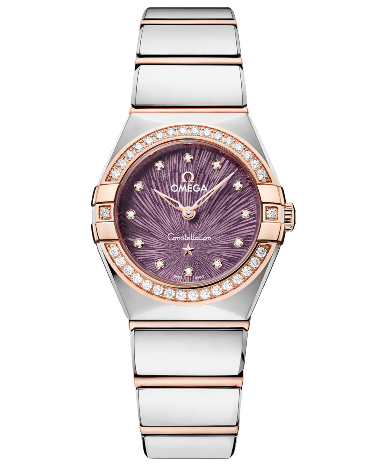 Sedna™ украшена безелемБезельВнешний ободок, закрепляющий стекло. В спортивных часах так называется поворотное кольцо с делениями на циферблате, выполняет роль таймера – замеряет отрезки времени на шкале. Неподвижный безель – элемент декора. Однонаправленно вращающийся безель на дайверских часах позволяет фиксировать моменты погружения и выныривания на поверхность. с бриллиантовой россыпью, сверкающей подобно звездному скоплению. Пурпурный циферблат с PVDPVDУльтратонкое покрытие наносится в технике вакуумного напыления, сочетает в себе нитрид титана особой прочности со слоем золота или оксида хрома. Несёт в себе декоративную или защитную функцию.-покрытием демонстрирует узор Supernova, где каждая линия, созданная методом электрохимического травления, повторяет движение небесных тел. Стрелки и звезда Constellation из 18-каратного золота18-каратное золотоОбозначение по каратной системе пробирования, оно показывает, сколько драгоценного металла содержится в изделии. 18 карат - в составе 75% чистого золота, соответствует 750 пробе.