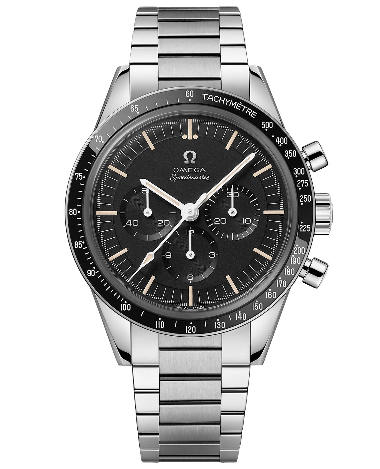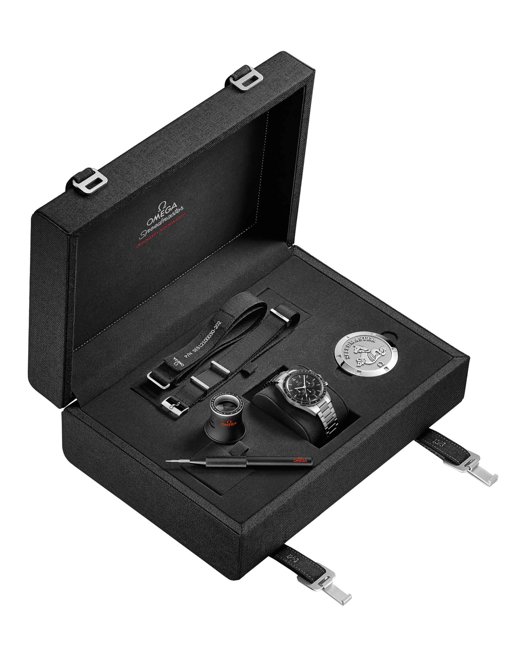 Speedmaster, участник всех шести лунных миссий, по праву считаются легендой часового искусства. В этой модели возрожден легендарный калибр 321 – живое свидетельство космической истории бренда. 39,7-миллиметровый корпус из нержавеющей стали воспроизводит черты часов 3-го поколения, которые в 1965 году первыми вышли в открытый космос. БезельБезельВнешний ободок, закрепляющий стекло. В спортивных часах так называется поворотное кольцо с делениями на циферблате, выполняет роль таймера – замеряет отрезки времени на шкале. Неподвижный безель – элемент декора. Однонаправленно вращающийся безель на дайверских часах позволяет фиксировать моменты погружения и выныривания на поверхность. из полированной черной керамики [ZrO2] украшен тахиметрическойТахиметрРазмеченная шкала, располагается на ободке или безеле часов. Тахиметр позволяет рассчитать скорость на определённом участке пути, расстояние измеряется в километрах или милях. шкалой в белой эмали. Классический черный циферблат сочетает фирменные стрелки Moonwatch, винтажный логотип OMEGA, счетчик малых секунд, 30-минутный и 12-часовой счетчики с центральной хронографной стрелкойХронографФункция позволяет измерять отрезки времени с особой точностью: часы, минуты, секунды. Верным признаком хронографа является наличие на циферблате 3 дополнительных окошек-счётчиков.. Сапфировое стеклоСапфировое стеклоПрочный и надёжный материал из кристалла сапфира синтетического происхождения, характеризующийся особой твёрдостью и устойчивостью к царапинам и повреждениям. задней крышки открывает вид на исторический механизм 321.