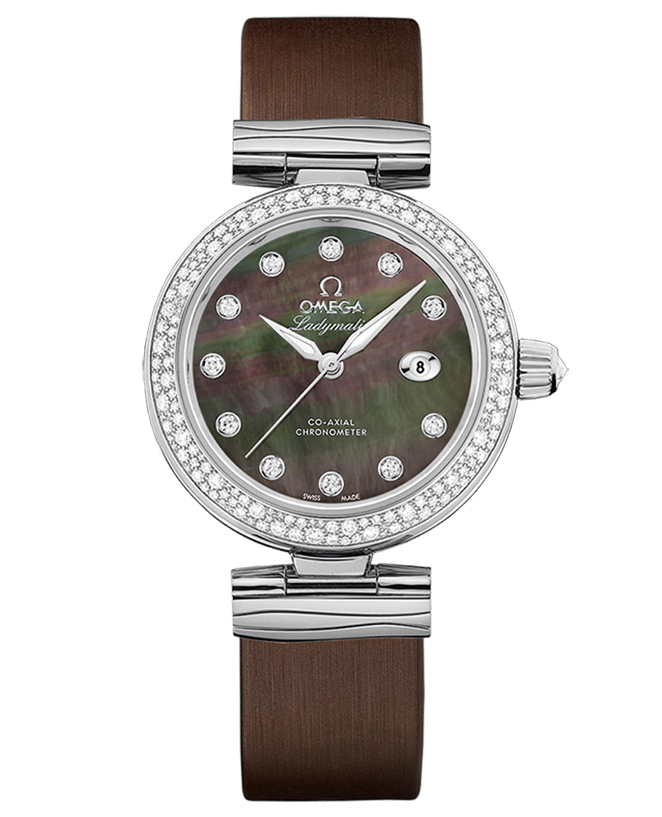 формы "альфа" и 11 бриллиантовых индексов танцуют на мерцающем циферблате из таитянского перламутра, обрамленном безелемБезельВнешний ободок, закрепляющий стекло. В спортивных часах так называется поворотное кольцо с делениями на циферблате, выполняет роль таймера – замеряет отрезки времени на шкале. Неподвижный безель – элемент декора. Однонаправленно вращающийся безель на дайверских часах позволяет фиксировать моменты погружения и выныривания на поверхность. с россыпью бриллиантов. Заводная головка с алмазом огранки "Brilliant OMEGA Cut" добавляет ноту роскоши, а окошко даты на "3 часах" – практичности. Внутри бьется сердце истинной леди – коаксиальный механизм OMEGA калибра 8520, сохраняющий безупречный ритм уже более шести десятилетий.