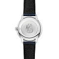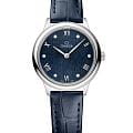 Коллекция OMEGA De Ville Prestige, сохраняющая свою актуальность с 1994 года, предстает в третьем поколении. Часы продолжают быть символом классического дизайна и утонченной элегантности. Модели, которые привлекают внимание разнообразием узоров, отделок и цветов, идеально подойдут для людей с различными стилями жизни и характерами. Часы в корпусе диаметром 27,5 мм из нержавеющей стали имеют циферблат с PVD-покрытиемPVDУльтратонкое покрытие наносится в технике вакуумного напыления, сочетает в себе нитрид титана особой прочности со слоем золота или оксида хрома. Несёт в себе декоративную или защитную функцию. синего цвета, украшенный рельефным произвольным вертикальным узором и радиальным сатинированием. На циферблате расположены стрелки с родиевым покрытием, а также чередующиеся римские цифры и метки из бриллиантов. Изделие с лаконичным дизайном дополнено задней крышкой, украшенной рельефным медальоном с изображением бога времени Хроноса. Часы представлены с переливающимся кожаным ремешком темно-синего цвета. Модель оснащена кварцевым механизмом OMEGA 4061, который обеспечивает срок службы элемента питания не менее 48 месяцев.