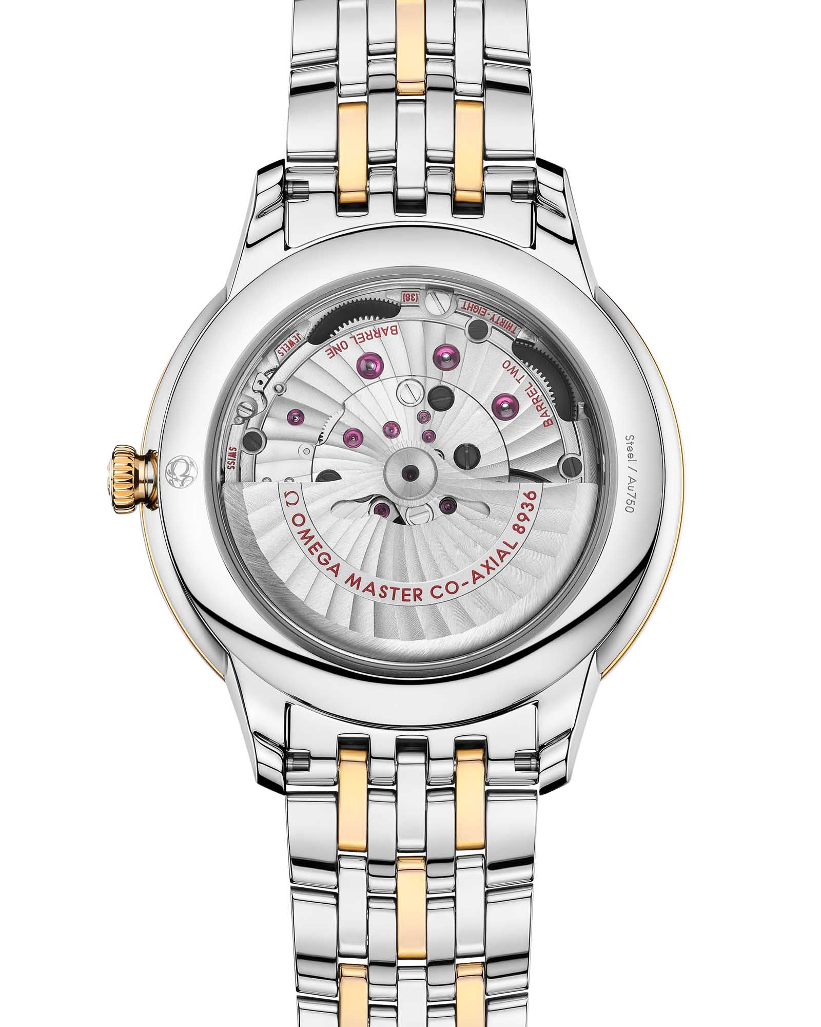 завершает образ, а сапфировое стеклоСапфировое стеклоПрочный и надёжный материал из кристалла сапфира синтетического происхождения, характеризующийся особой твёрдостью и устойчивостью к царапинам и повреждениям. задней крышки раскрывает взору калибр Co-Axial Master Chronometer 8936 — символ часового совершенства.