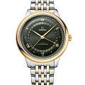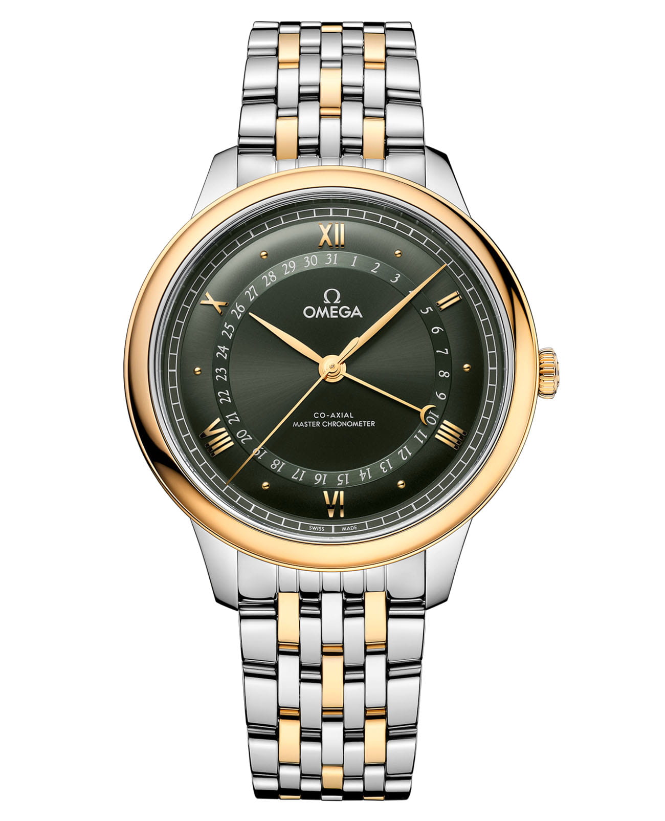обрамляет завораживающий циферблат с зеленым PVD-покрытиемPVDУльтратонкое покрытие наносится в технике вакуумного напыления, сочетает в себе нитрид титана особой прочности со слоем золота или оксида хрома. Несёт в себе декоративную или защитную функцию. и узором "солнечные лучи". Минутная шкала "железная дорога" гармонично сочетается с чередующимися римскими цифрами и кабошонами, создавая игру света и тени. Индикатор даты с сатинированным кольцом и стрелкой из желтого золота с полумесяцем добавляет функциональную изысканность. Браслет из стали и золота Sedna™18-каратное золотоОбозначение по каратной системе пробирования, оно показывает, сколько драгоценного металла содержится в изделии. 18 карат - в составе 75% чистого золота, соответствует 750 пробе.