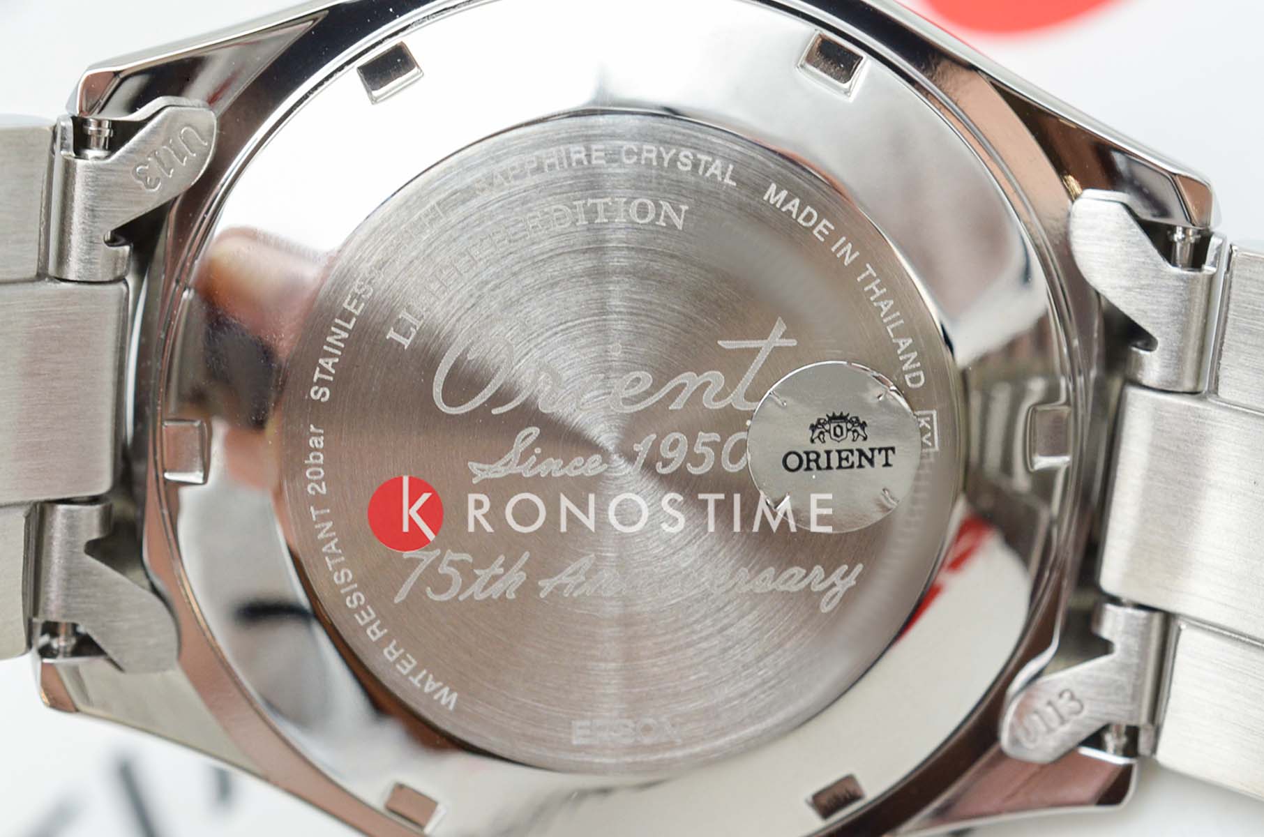 Orient RA‑AA0823L ‘75th Anniversary’ Kamasu (Mako) — лимитированная модель в коллекции дайверских часов, посвящённая 75-летию бренда. Корпус из нержавеющей стали диаметром 41,8 мм с безелем синего цвета оформлен в традиционном стиле, при этом обладает утончёнными юбилейными акцентами и гармоничными пропорциями.