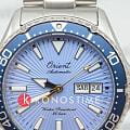 Циферблат выполнен в небесно-голубом оттенке с эффектом солнечных лучей. Эстетику подчёркивает винтажный логотип Orient, а крупные часовые метки и стрелки с люминесцентным покрытиемЛюминесцентное покрытиеПозволяет считывать показания времени в темноте. Производители наносят на стрелки, часовые индексы, безель или поверхность циферблата светонакопительный состав, дающий холодное свечение. обеспечивают отличную читаемость. Защиту обеспечивает устойчивое к царапинам сапфировое стеклоСапфировое стеклоПрочный и надёжный материал из кристалла сапфира синтетического происхождения, характеризующийся особой твёрдостью и устойчивостью к царапинам и повреждениям..