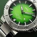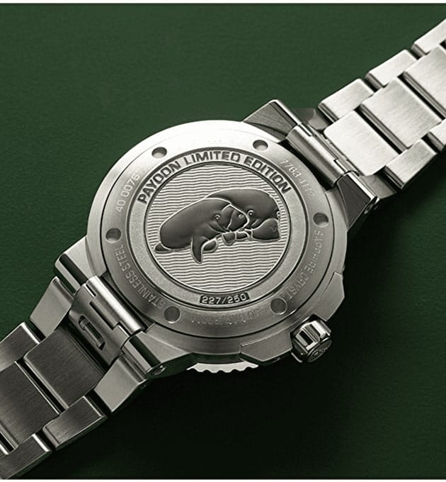 Ограниченная серия Payoon создана на базе Oris Aquis Date Calibre 400 и выпущена ограниченной серией из 250 экземпляров. Она имеет зеленый циферблат, напоминающий цвет воды острова Ко Либонг, серый рельефный безель, напоминающий цвет кожи дюгоней, и гравировку с изображением дюгоня и его детеныша на задней крышке.