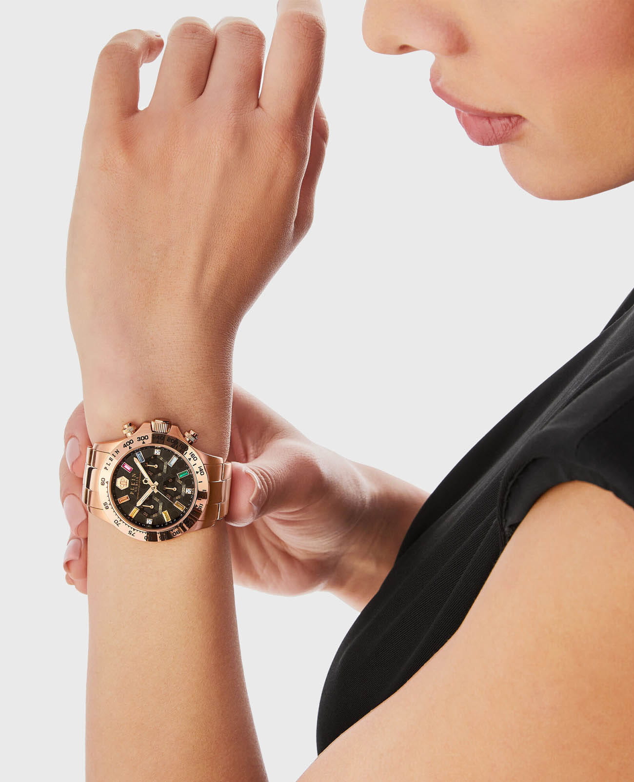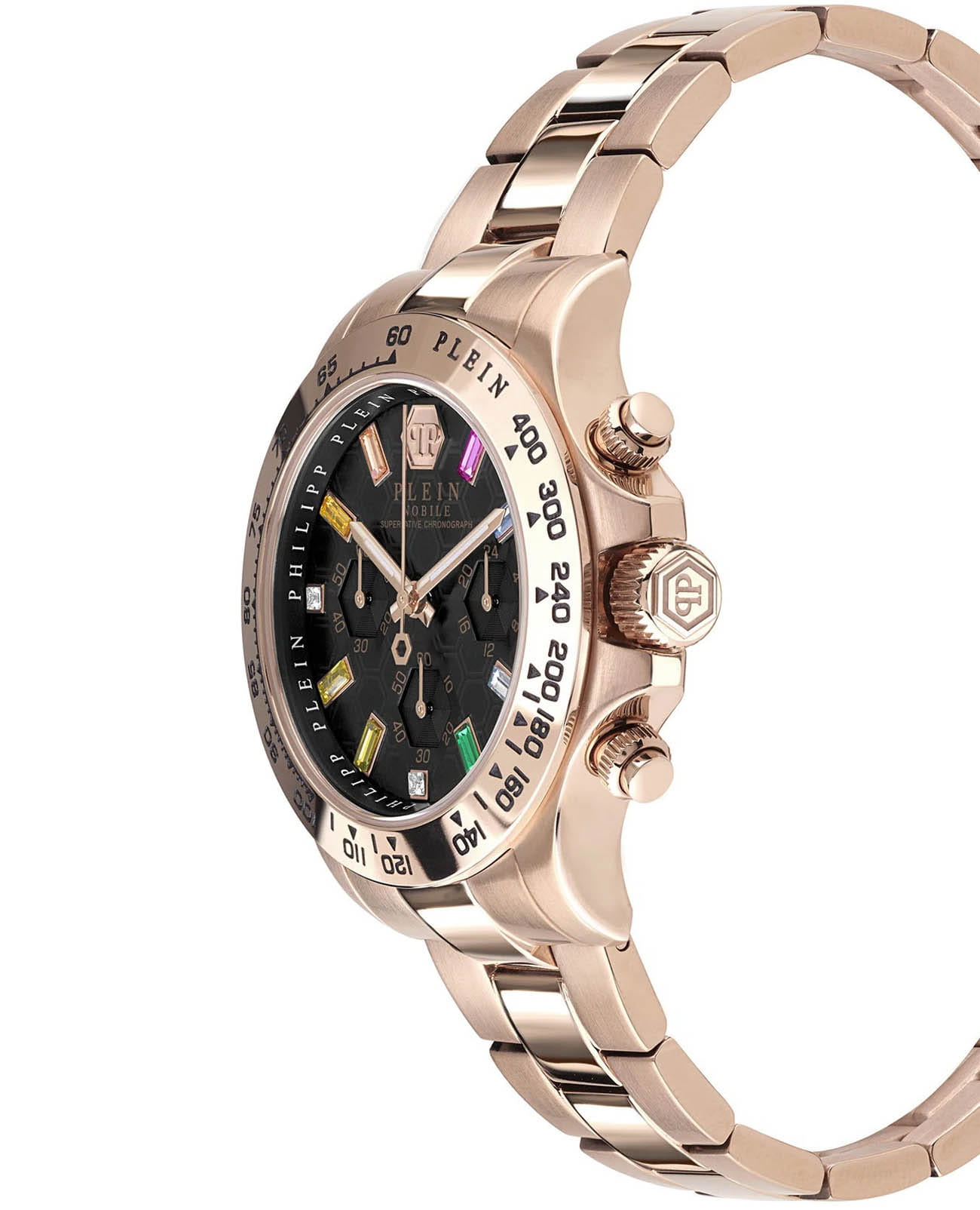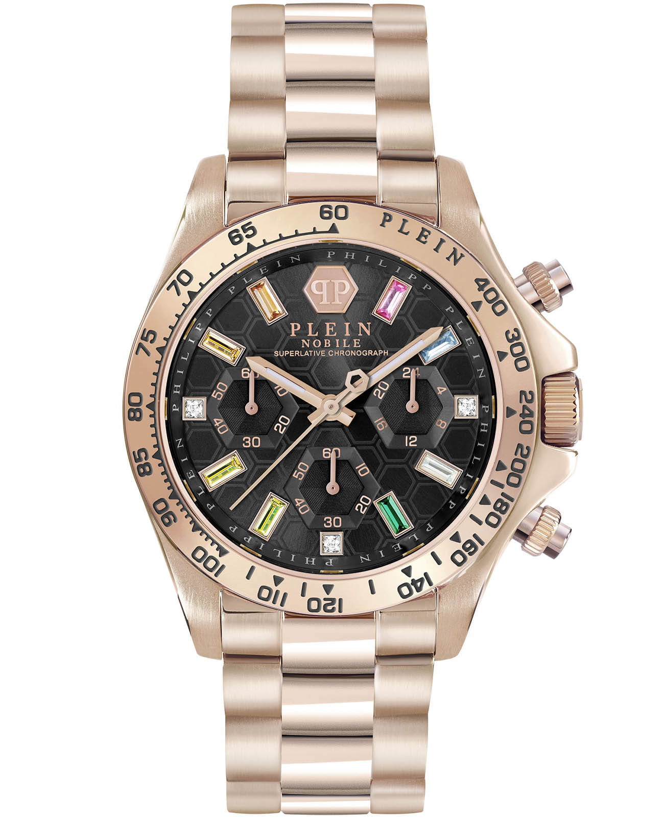 Яркие женские часы-хронографХронографФункция позволяет измерять отрезки времени с особой точностью: часы, минуты, секунды. Верным признаком хронографа является наличие на циферблате 3 дополнительных окошек-счётчиков. с секундомеромСекундомерСекундоме́р — прибор, способный измерять интервалы времени с точностью до долей секунды. Philipp Plein Nobile Lady PWSBA0423, кварцевый механизм с высокой точностью. 12 и 24-часовой формат времени. Класс водозащиты: 50 метров, позволит защитить корпус от случайных брызг или капель дождя. Корпус и браслет часов изготовлены из стали с IP-покрытиемIP-покрытиеМетод ионного напыления. Демонстрирует повышенную устойчивость к истиранию, окислению и химическим веществам. Под воздействием высокого давления и температуры около 1500°C молекулы металла надёжно соединяются с частицами корпуса часов.. Стрелки с люминесцентным покрытиемЛюминесцентное покрытиеПозволяет считывать показания времени в темноте. Производители наносят на стрелки, часовые индексы, безель или поверхность циферблата светонакопительный состав, дающий холодное свечение.. Стальной браслет на застёжке-бабочке с кнопкамиЗастёжка "бабочка"Такой вид застёжки дополняется предохранителями, помогающими избежать случайного раскрытия браслета. Обладают изящным исполнением. . Циферблат инкрустирован кристаллами Preciosa.