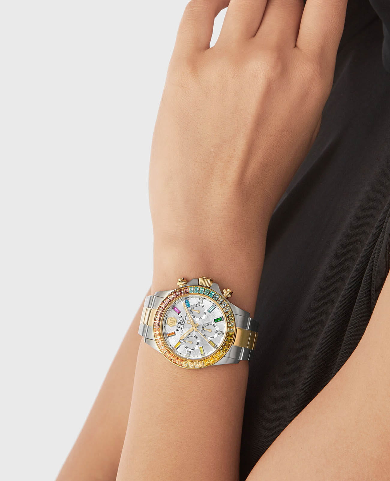 Яркие женские часы-хронографХронографФункция позволяет измерять отрезки времени с особой точностью: часы, минуты, секунды. Верным признаком хронографа является наличие на циферблате 3 дополнительных окошек-счётчиков. с секундомеромСекундомерСекундоме́р — прибор, способный измерять интервалы времени с точностью до долей секунды. Philipp Plein Nobile Lady PWSBA0523, кварцевый механизм с высокой точностью. 12 и 24-часовой формат времени. Класс водозащиты: 50 метров, позволит защитить корпус от случайных брызг или капель дождя. Корпус часов изготовлен из нержавеющей стали. Стрелки с люминесцентным покрытиемЛюминесцентное покрытиеПозволяет считывать показания времени в темноте. Производители наносят на стрелки, часовые индексы, безель или поверхность циферблата светонакопительный состав, дающий холодное свечение.. Стальной браслет с частичным IP-покрытиемIP-покрытиеМетод ионного напыления. Демонстрирует повышенную устойчивость к истиранию, окислению и химическим веществам. Под воздействием высокого давления и температуры около 1500°C молекулы металла надёжно соединяются с частицами корпуса часов. на застёжке-бабочке с кнопкамиЗастёжка "бабочка"Такой вид застёжки дополняется предохранителями, помогающими избежать случайного раскрытия браслета. Обладают изящным исполнением. . БезельБезельВнешний ободок, закрепляющий стекло. В спортивных часах так называется поворотное кольцо с делениями на циферблате, выполняет роль таймера – замеряет отрезки времени на шкале. Неподвижный безель – элемент декора. Однонаправленно вращающийся безель на дайверских часах позволяет фиксировать моменты погружения и выныривания на поверхность. и циферблат инкрустированы кристаллами Preciosa.