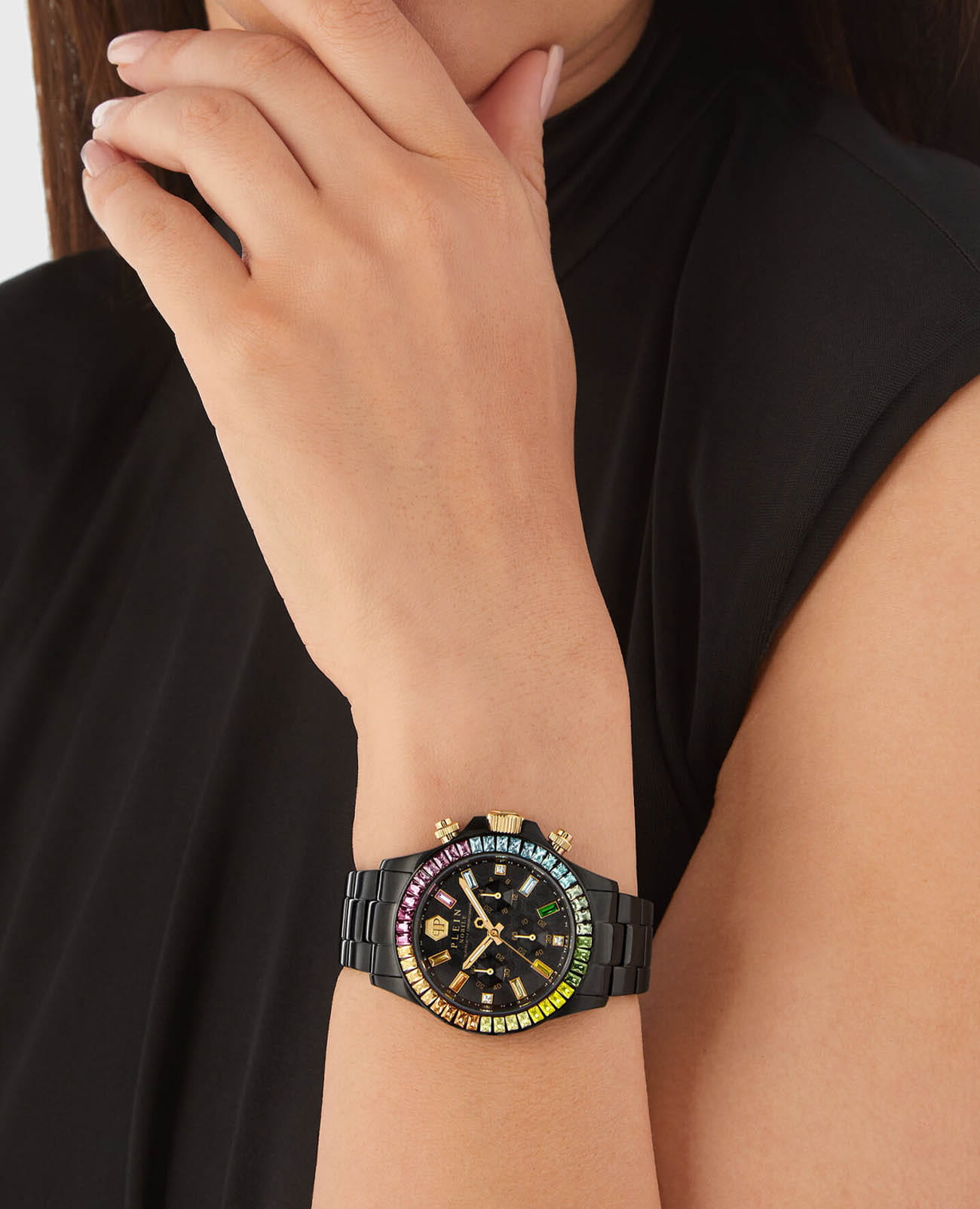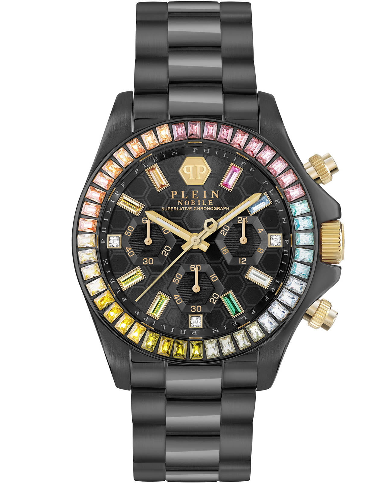 Яркие женские часы-хронографХронографФункция позволяет измерять отрезки времени с особой точностью: часы, минуты, секунды. Верным признаком хронографа является наличие на циферблате 3 дополнительных окошек-счётчиков. с секундомеромСекундомерСекундоме́р — прибор, способный измерять интервалы времени с точностью до долей секунды. Philipp Plein Nobile Lady PWSBA0623, кварцевый механизм с высокой точностью. 12 и 24-часовой формат времени. Класс водозащиты: 50 метров, позволит защитить корпус от случайных брызг или капель дождя. Корпус и браслет часов изготовлены из нержавеющей стали с IP-покрытиемIP-покрытиеМетод ионного напыления. Демонстрирует повышенную устойчивость к истиранию, окислению и химическим веществам. Под воздействием высокого давления и температуры около 1500°C молекулы металла надёжно соединяются с частицами корпуса часов.. Стрелки с люминесцентным покрытиемЛюминесцентное покрытиеПозволяет считывать показания времени в темноте. Производители наносят на стрелки, часовые индексы, безель или поверхность циферблата светонакопительный состав, дающий холодное свечение.. Стальной браслет на застёжке-бабочке с кнопкамиЗастёжка "бабочка"Такой вид застёжки дополняется предохранителями, помогающими избежать случайного раскрытия браслета. Обладают изящным исполнением. . БезельБезельВнешний ободок, закрепляющий стекло. В спортивных часах так называется поворотное кольцо с делениями на циферблате, выполняет роль таймера – замеряет отрезки времени на шкале. Неподвижный безель – элемент декора. Однонаправленно вращающийся безель на дайверских часах позволяет фиксировать моменты погружения и выныривания на поверхность. и циферблат инкрустированы кристаллами Preciosa.