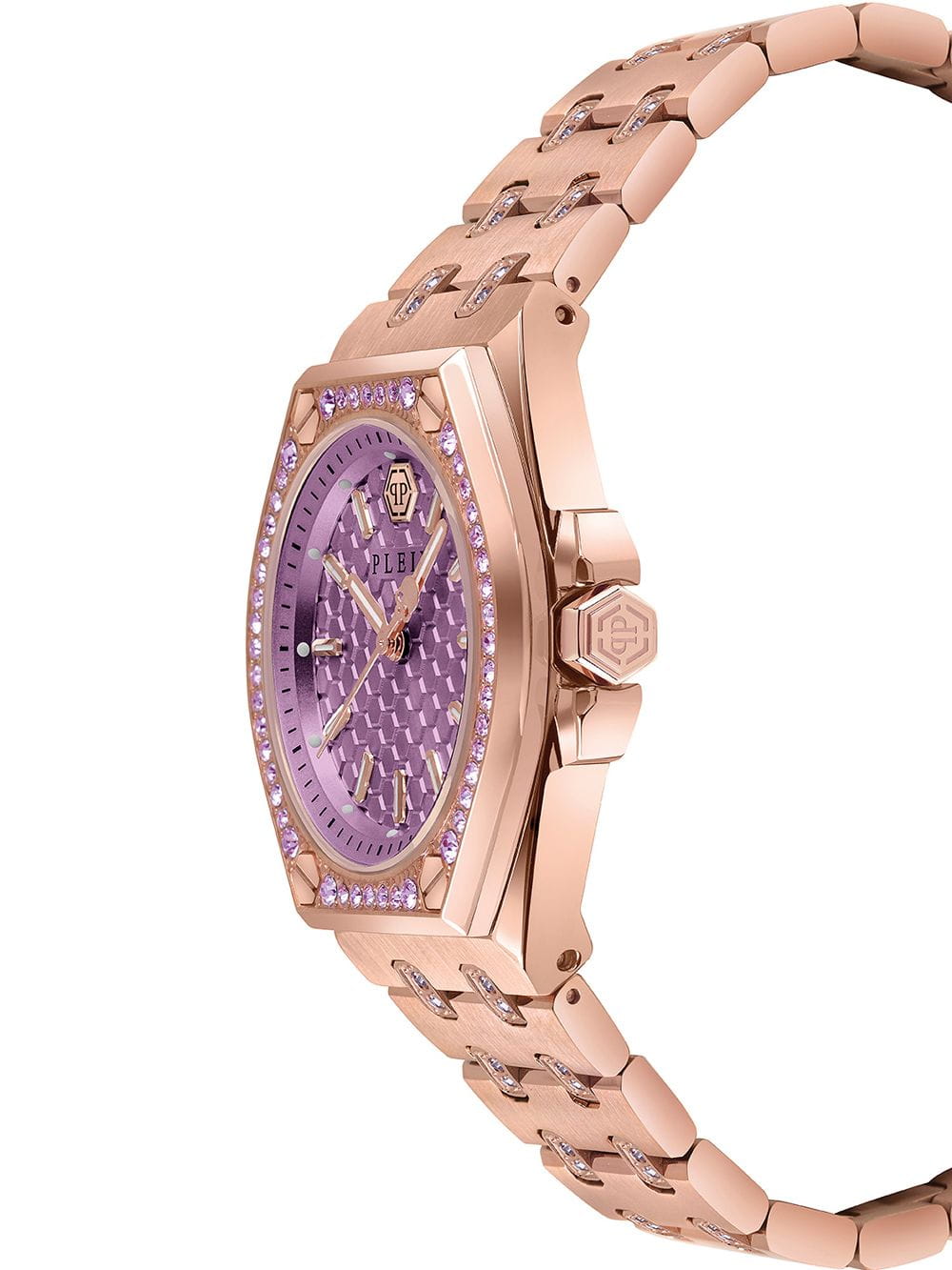 Женские немецкие кварцевые часы Philipp Plein Extreme Lady PWJAA0922, кварцевый механизм с высокой точностью. Класс водозащиты: 50 метров, позволит защитить корпус от случайных брызг или капель дождя. Корпус часов изготовлен из стали с IP-покрытиемIP-покрытиеМетод ионного напыления. Демонстрирует повышенную устойчивость к истиранию, окислению и химическим веществам. Под воздействием высокого давления и температуры около 1500°C молекулы металла надёжно соединяются с частицами корпуса часов. цвета розовое золото. Прочное минеральное стеклоМинеральное стеклоМинеральное стекло представляет собой искусственно выращенный минерал кварца. Такое стекло отличается особой устойчивостью к повреждениям и царапинам. Уступает по некоторым качествам сапфировому стеклу. устойчивое к мелким механическим повреждениям. Застёжка бабочка с кнопкамиЗастёжка "бабочка"Такой вид застёжки дополняется предохранителями, помогающими избежать случайного раскрытия браслета. Обладают изящным исполнением.