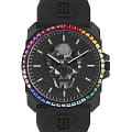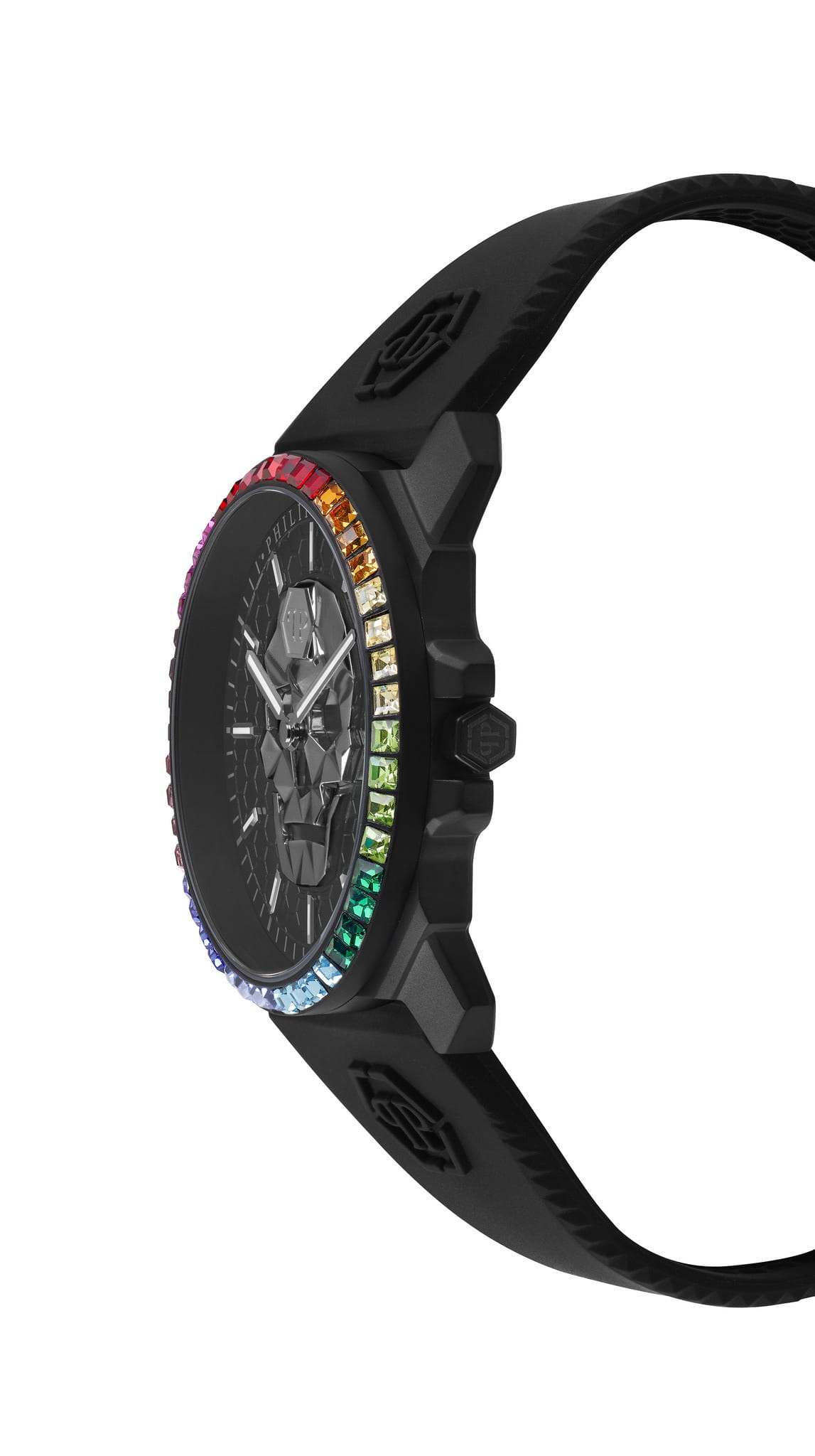 Мужские кварцевые часы с фирменным изображением черепа Philipp Plein The Skull King PWLAA0522, кварцевый механизм с высокой точностью. Класс водозащиты: 50 метров, позволит защитить корпус от случайных брызг или капель дождя. Корпус часов изготовлен из стали с IP-покрытиемIP-покрытиеМетод ионного напыления. Демонстрирует повышенную устойчивость к истиранию, окислению и химическим веществам. Под воздействием высокого давления и температуры около 1500°C молекулы металла надёжно соединяются с частицами корпуса часов. черного цвета. Черный силиконовый ремешок шириной 26 мм, стандартная застежка. Прочное минеральное стеклоМинеральное стеклоМинеральное стекло представляет собой искусственно выращенный минерал кварца. Такое стекло отличается особой устойчивостью к повреждениям и царапинам. Уступает по некоторым качествам сапфировому стеклу. устойчивое к мелким механическим повреждениям. БезельБезельВнешний ободок, закрепляющий стекло. В спортивных часах так называется поворотное кольцо с делениями на циферблате, выполняет роль таймера – замеряет отрезки времени на шкале. Неподвижный безель – элемент декора. Однонаправленно вращающийся безель на дайверских часах позволяет фиксировать моменты погружения и выныривания на поверхность. инкрустирован кристаллами Preciosa.