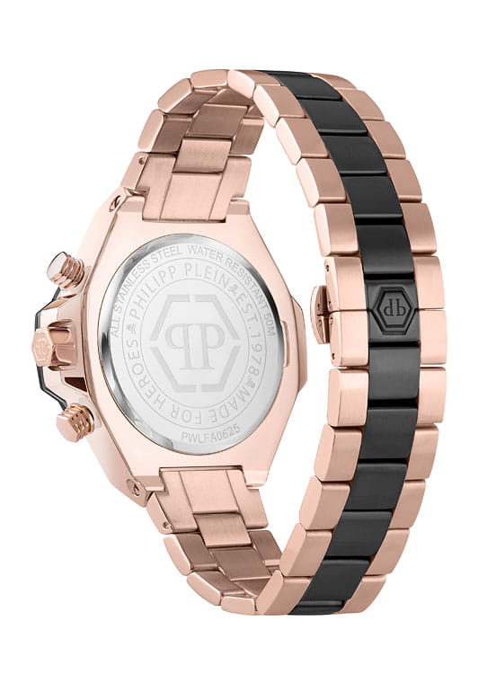 Philipp Plein Plein Chrono Royal PWLFA0625 - это дерзкие и бескомпромиссные часы, воплощающие бунтарский дух бренда. Диаметр корпуса из прочной нержавеющей стали равен 46 мм. Стальной браслет на застёжке-бабочке с кнопкамиЗастёжка "бабочка"Такой вид застёжки дополняется предохранителями, помогающими избежать случайного раскрытия браслета. Обладают изящным исполнением. обеспечивает надёжную фиксацию и комфортное ношение. Метки в виде точек. Минеральное стеклоМинеральное стеклоМинеральное стекло представляет собой искусственно выращенный минерал кварца. Такое стекло отличается особой устойчивостью к повреждениям и царапинам. Уступает по некоторым качествам сапфировому стеклу. защищает циферблат от царапин. БезельБезельВнешний ободок, закрепляющий стекло. В спортивных часах так называется поворотное кольцо с делениями на циферблате, выполняет роль таймера – замеряет отрезки времени на шкале. Неподвижный безель – элемент декора. Однонаправленно вращающийся безель на дайверских часах позволяет фиксировать моменты погружения и выныривания на поверхность. с PVD-покрытиемPVDУльтратонкое покрытие наносится в технике вакуумного напыления, сочетает в себе нитрид титана особой прочности со слоем золота или оксида хрома. Несёт в себе декоративную или защитную функцию.. Функциональность хронографаХронографФункция позволяет измерять отрезки времени с особой точностью: часы, минуты, секунды. Верным признаком хронографа является наличие на циферблате 3 дополнительных окошек-счётчиков. позволяет точно измерять время, а надежный кварцевый механизм гарантирует безупречную работу. Люминесцентное покрытиеЛюминесцентное покрытиеПозволяет считывать показания времени в темноте. Производители наносят на стрелки, часовые индексы, безель или поверхность циферблата светонакопительный состав, дающий холодное свечение. стрелок и меток позволит следить за временем даже в полной темноте. Граненая заводная головка. Влагозащита: 50 метров, позволит защитить корпус от случайных брызг или капель дождя. Идеальный аксессуар для тех, кто ценит индивидуальность и не боится выделяться из толпы.