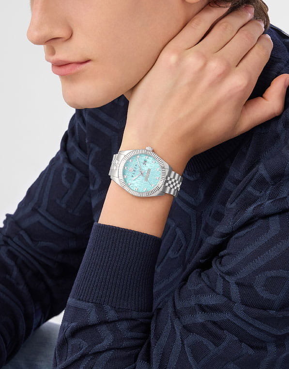 Philipp Plein Date Superlative Gent PWMFA0225 - это дерзкие и бескомпромиссные часы, воплощающие бунтарский дух бренда. Диаметр круглого корпуса из прочной нержавеющей стали равен 41 мм. Стальной браслет на застёжке «бабочка» с кнопкамиЗастёжка "бабочка"Такой вид застёжки дополняется предохранителями, помогающими избежать случайного раскрытия браслета. Обладают изящным исполнением. обеспечивает надёжную фиксацию и комфортное ношение. Метки в виде кристаллов Preciosa. Минеральное стеклоМинеральное стеклоМинеральное стекло представляет собой искусственно выращенный минерал кварца. Такое стекло отличается особой устойчивостью к повреждениям и царапинам. Уступает по некоторым качествам сапфировому стеклу. защищает циферблат от царапин. Люминесцентное покрытиеЛюминесцентное покрытиеПозволяет считывать показания времени в темноте. Производители наносят на стрелки, часовые индексы, безель или поверхность циферблата светонакопительный состав, дающий холодное свечение. стрелок и меток позволит следить за временем даже в полной темноте. Граненая заводная головка. Влагозащита: 50 метров, позволит защитить корпус от случайных брызг или капель дождя. Идеальный аксессуар для тех, кто ценит индивидуальность и не боится выделяться из толпы.