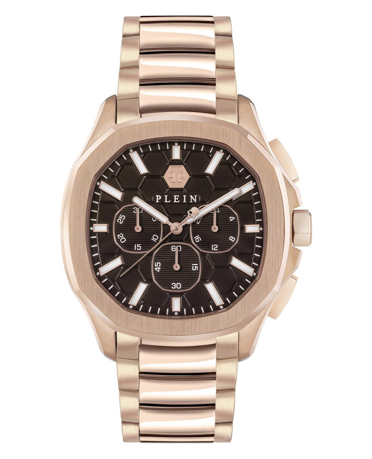 Яркие мужские часы-хронографХронографФункция позволяет измерять отрезки времени с особой точностью: часы, минуты, секунды. Верным признаком хронографа является наличие на циферблате 3 дополнительных окошек-счётчиков. с секундомеромСекундомерСекундоме́р — прибор, способный измерять интервалы времени с точностью до долей секунды. Philipp Plein PWSAA0623, кварцевый механизм с высокой точностью. Класс водозащиты: 50 метров, позволит защитить корпус от случайных брызг или капель дождя. Корпус часов изготовлен из стали с IP-покрытиемIP-покрытиеМетод ионного напыления. Демонстрирует повышенную устойчивость к истиранию, окислению и химическим веществам. Под воздействием высокого давления и температуры около 1500°C молекулы металла надёжно соединяются с частицами корпуса часов.. Стрелки и метки с люминесцентным покрытиемЛюминесцентное покрытиеПозволяет считывать показания времени в темноте. Производители наносят на стрелки, часовые индексы, безель или поверхность циферблата светонакопительный состав, дающий холодное свечение.. Застёжка бабочка с кнопкамиЗастёжка "бабочка"Такой вид застёжки дополняется предохранителями, помогающими избежать случайного раскрытия браслета. Обладают изящным исполнением.
