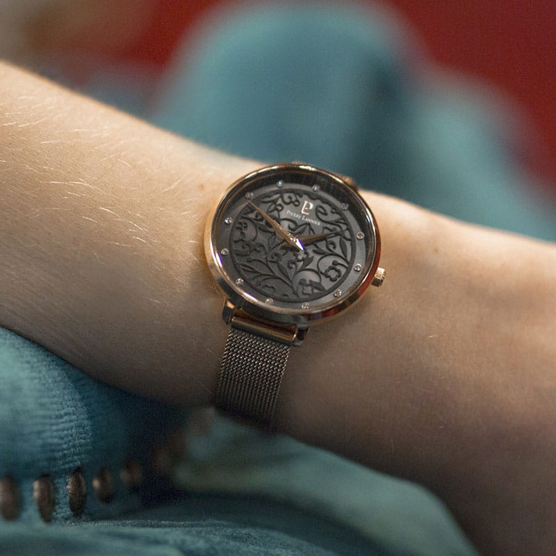 Женские кварцевые часы Pierre Lannier Eolia 039L938. Минеральное стеклоМинеральное стеклоМинеральное стекло представляет собой искусственно выращенный минерал кварца. Такое стекло отличается особой устойчивостью к повреждениям и царапинам. Уступает по некоторым качествам сапфировому стеклу. устойчивое к мелким механическим повреждениям. Центральные часовая и минутная стрелки. Корпус выполнен из нержавеющей стали с PVD-покрытиемPVDУльтратонкое покрытие наносится в технике вакуумного напыления, сочетает в себе нитрид титана особой прочности со слоем золота или оксида хрома. Несёт в себе декоративную или защитную функцию.. Водостойкость: 50 метров, позволит защитить корпус от случайных брызг или капель дождя. Стальной браслет миланского плетения с раскладной застёжкойРаскладная застёжкаТакой тип застёжки используется только на браслетах из металла. Она никогда не раскрывается полностью, происходит разделение на 2 и более частей. Раскладывающая застёжка снизит вероятность потери часов к минимуму.. Черный циферблат украшен кристаллами.