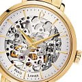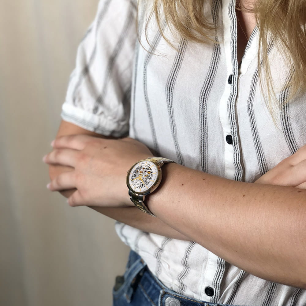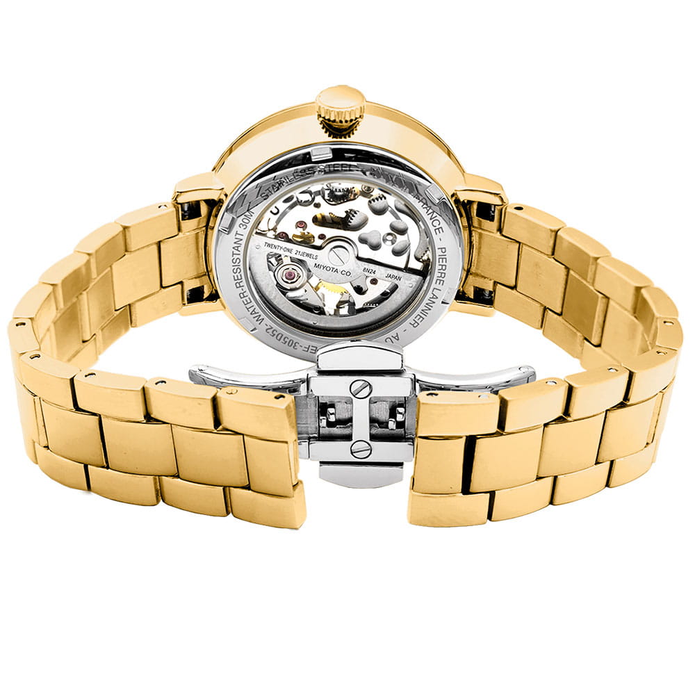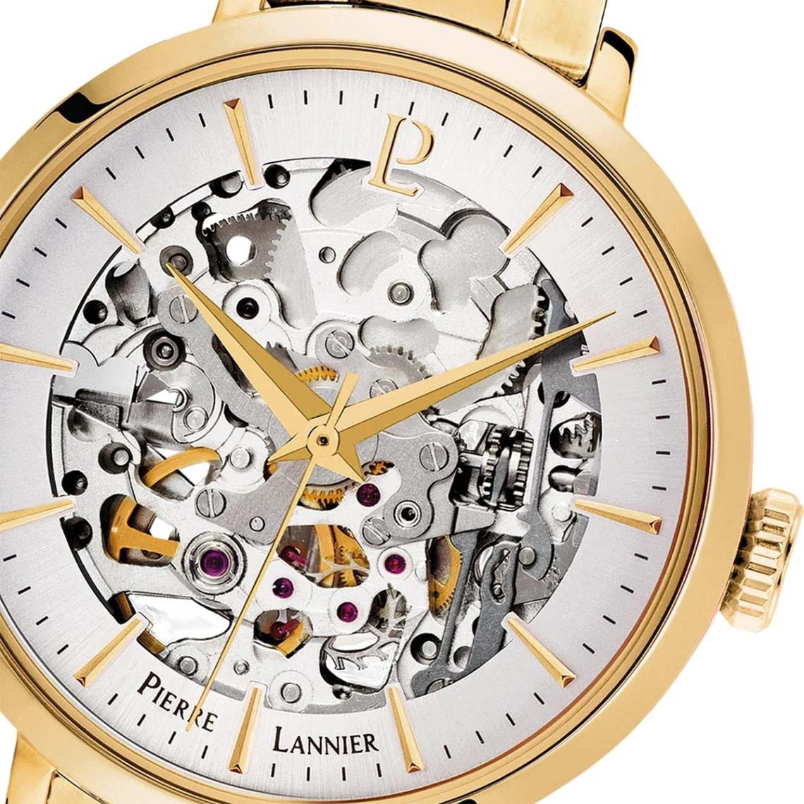Женские механические часы с автоподзаводом Pierre Lannier Automatic 305D528. Минеральное стеклоМинеральное стеклоМинеральное стекло представляет собой искусственно выращенный минерал кварца. Такое стекло отличается особой устойчивостью к повреждениям и царапинам. Уступает по некоторым качествам сапфировому стеклу. устойчивое к мелким механическим повреждениям. Серебристый скелетонизированный циферблат. Центральные часовая, минутная и секундная стрелки. Корпус и браслет выполнен из нержавеющей стали с IP-покрытиемIP-покрытиеМетод ионного напыления. Демонстрирует повышенную устойчивость к истиранию, окислению и химическим веществам. Под воздействием высокого давления и температуры около 1500°C молекулы металла надёжно соединяются с частицами корпуса часов.. Водостойкость: 30 метров, позволит защитить корпус от случайных брызг или капель дождя. Стальной браслет с раскладной застёжкойРаскладная застёжкаТакой тип застёжки используется только на браслетах из металла. Она никогда не раскрывается полностью, происходит разделение на 2 и более частей. Раскладывающая застёжка снизит вероятность потери часов к минимуму..