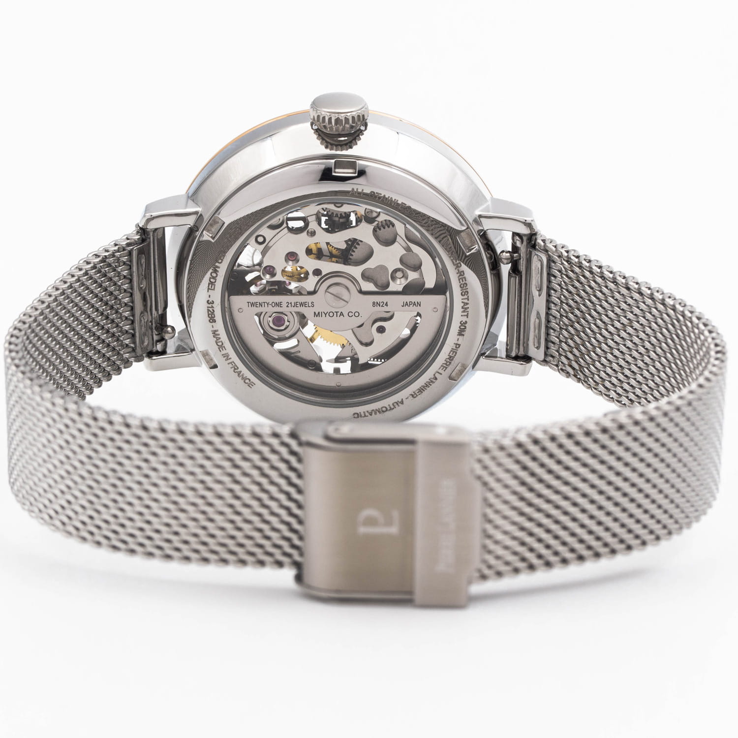 Женские механические часы с автоподзаводом Pierre Lannier Automatic 312B628. Минеральное стеклоМинеральное стеклоМинеральное стекло представляет собой искусственно выращенный минерал кварца. Такое стекло отличается особой устойчивостью к повреждениям и царапинам. Уступает по некоторым качествам сапфировому стеклу. устойчивое к мелким механическим повреждениям. Скелетонизированный серебристый циферблат. Центральные часовая, минутная и секундная стрелки. Корпус выполнен из полированной нержавеющей стали . Неподвижный безельБезельВнешний ободок, закрепляющий стекло. В спортивных часах так называется поворотное кольцо с делениями на циферблате, выполняет роль таймера – замеряет отрезки времени на шкале. Неподвижный безель – элемент декора. Однонаправленно вращающийся безель на дайверских часах позволяет фиксировать моменты погружения и выныривания на поверхность. из нержавеющей стали с IP-покрытиемIP-покрытиеМетод ионного напыления. Демонстрирует повышенную устойчивость к истиранию, окислению и химическим веществам. Под воздействием высокого давления и температуры около 1500°C молекулы металла надёжно соединяются с частицами корпуса часов. . Водостойкость: 30 метров, позволит защитить корпус от случайных брызг или капель дождя. Стальной браслет на раскладной застёжкеРаскладная застёжкаТакой тип застёжки используется только на браслетах из металла. Она никогда не раскрывается полностью, происходит разделение на 2 и более частей. Раскладывающая застёжка снизит вероятность потери часов к минимуму..