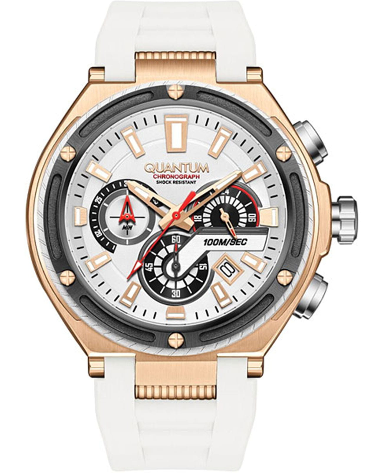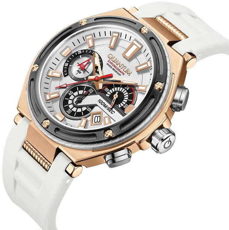 Мужские кварцевые часы Quantum HNG1010.835 из коллекции Hunter — крупные, надёжные и функциональные спортивные часы в классическом исполнении. Корпус круглый, из нержавеющей стали с PVD-покрытиемPVDУльтратонкое покрытие наносится в технике вакуумного напыления, сочетает в себе нитрид титана особой прочности со слоем золота или оксида хрома. Несёт в себе декоративную или защитную функцию., диаметром 50 мм. Циферблат белый со штриховыми метками, с функциями хронографаХронографФункция позволяет измерять отрезки времени с особой точностью: часы, минуты, секунды. Верным признаком хронографа является наличие на циферблате 3 дополнительных окошек-счётчиков. и окошком даты. БезельБезельВнешний ободок, закрепляющий стекло. В спортивных часах так называется поворотное кольцо с делениями на циферблате, выполняет роль таймера – замеряет отрезки времени на шкале. Неподвижный безель – элемент декора. Однонаправленно вращающийся безель на дайверских часах позволяет фиксировать моменты погружения и выныривания на поверхность. с PVD-покрытиемPVDУльтратонкое покрытие наносится в технике вакуумного напыления, сочетает в себе нитрид титана особой прочности со слоем золота или оксида хрома. Несёт в себе декоративную или защитную функцию. чёрный. Стекло — минеральноеМинеральное стеклоМинеральное стекло представляет собой искусственно выращенный минерал кварца. Такое стекло отличается особой устойчивостью к повреждениям и царапинам. Уступает по некоторым качествам сапфировому стеклу. с антибликовым покрытием. Механизм — японский кварцевый Seiko. Корпус — ударопрочныйУдаропрочный корпусМеханизм заключён в корпус, выполненный из современных материалов, устойчивых к ударам, механическим повреждениям и падению с высоты: инновационный пластик, карбон, нержавеющая сталь, титан.. Водонепроницаемость 100 м. Ремешок — белый силиконовый на стандартной застёжке. Идеальный выбор для тех, кто ценит турецкий дизайн и повседневную надёжность.