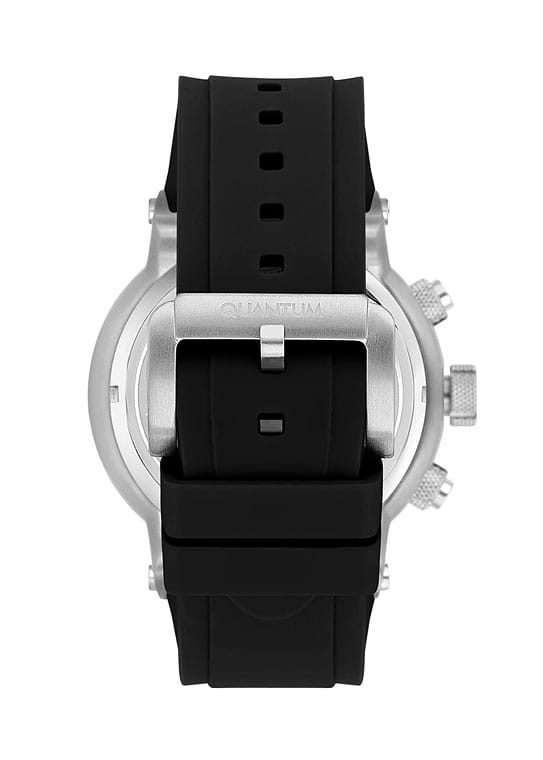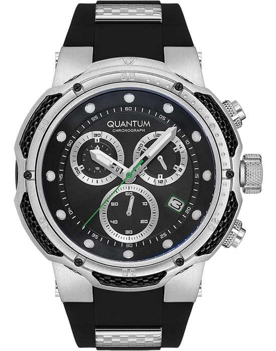 Мужские наручные часы-хронографХронографФункция позволяет измерять отрезки времени с особой точностью: часы, минуты, секунды. Верным признаком хронографа является наличие на циферблате 3 дополнительных окошек-счётчиков. Quantum HNG1051.351, кварцевый механизм с высокой точностью. Класс водозащиты: 100 метров, позволит плавать, нырять и заниматься другими водными видами спорта. Корпус часов изготовлен из нержавеющей стали. Стрелки с люминесцентным покрытиемЛюминесцентное покрытиеПозволяет считывать показания времени в темноте. Производители наносят на стрелки, часовые индексы, безель или поверхность циферблата светонакопительный состав, дающий холодное свечение.. Каучуковый ремешок.