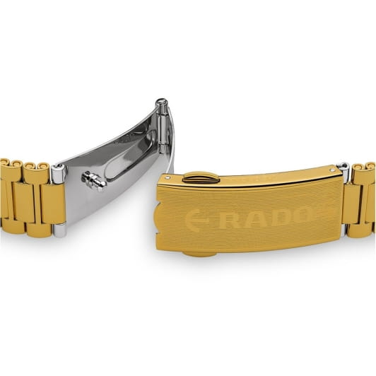 Мужские часы Rado The Original Automatic R12413583 с надёжным автоматическим механизмом. Корпус и браслет часов выполнены из нержавеющей стали c PVD-покрытиемPVDУльтратонкое покрытие наносится в технике вакуумного напыления, сочетает в себе нитрид титана особой прочности со слоем золота или оксида хрома. Несёт в себе декоративную или защитную функцию.. Стальной браслет на раскладной застёжкеРаскладная застёжкаТакой тип застёжки используется только на браслетах из металла. Она никогда не раскрывается полностью, происходит разделение на 2 и более частей. Раскладывающая застёжка снизит вероятность потери часов к минимуму.. Класс водозащиты: 30 метров, позволит защитить корпус от случайных брызг или капель дождя. Циферблат инкрустирован сапфирами. Окошко даты и дня недели находится в положении 6 часов.
