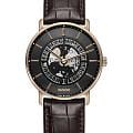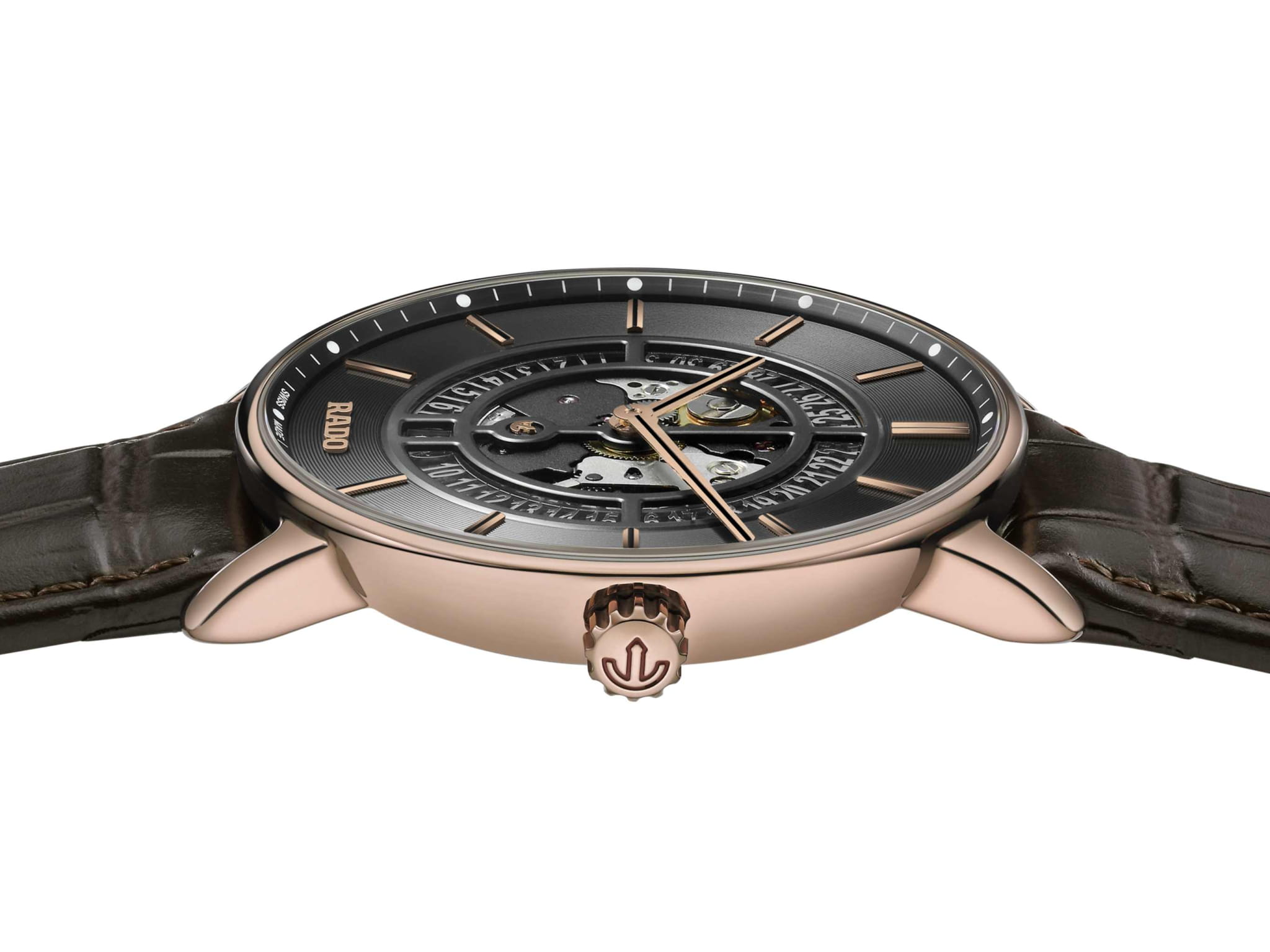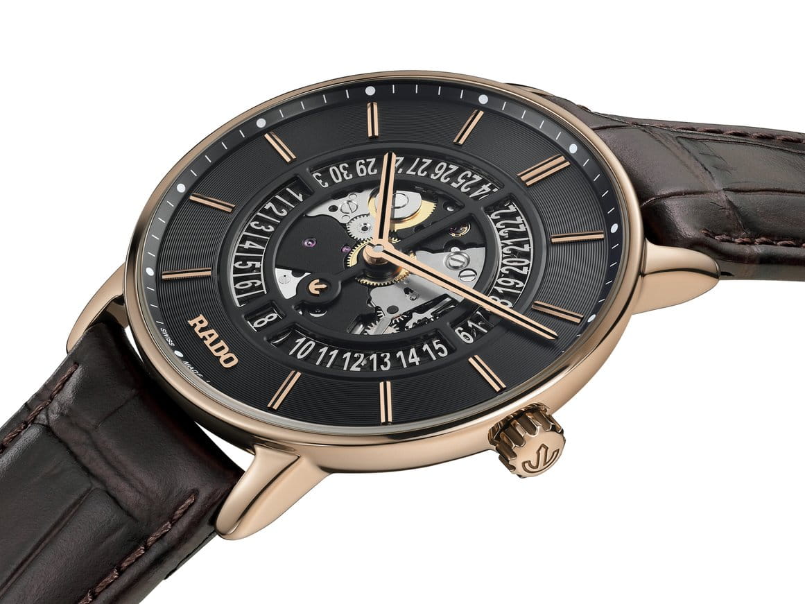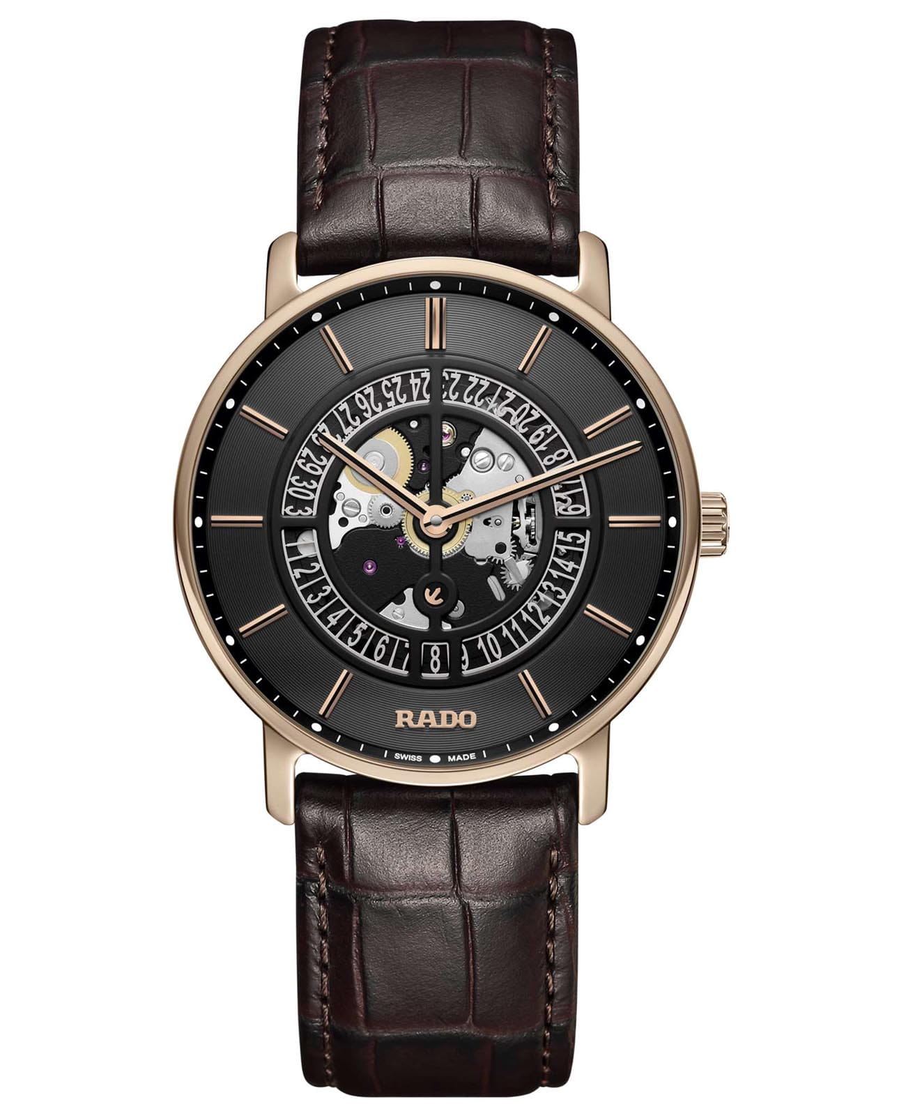 Мужские механические часы с автоподзаводом Rado из коллекции DiaMaster — это уникальное сочетание инноваций, элегантности и ограниченного выпуска. Модель выпущена тиражом 388 экземпляров. Корпус диаметром 41 мм и толщиной 8,3 мм выполнен из инновационного материала Ceramos™CeramosМатериал являет собой инновационное сочетание высокотехнологичной керамики и сплава металла. Он объединяет керамическую устойчивость к царапинам и металлический роскошный блеск. , сочетающего твёрдость керамики и прочность металла при минимальном весе. Циферблат чёрного цвета частично скелетонизирован, что позволяет наблюдать за работой механизма. Накладные индексы и стрелки розового золота с чёрным покрытием обеспечивают контраст и читаемость. Циферблат защищён сапфировым стекломСапфировое стеклоПрочный и надёжный материал из кристалла сапфира синтетического происхождения, характеризующийся особой твёрдостью и устойчивостью к царапинам и повреждениям.. Окошко даты расположено в положении 6 часов. Механизм — автоматический с запасом хода 72 часа и ротором с DLC-покрытиемDLC-покрытиеDiamond like carbon - одно из лучших видов покрытия, представляющее собой углерод с алмазными свойствами. На поверхность материала наносятся распавшиеся молекулы углерода, превращающиеся в плёнку из алмазоподобных связей, которая перенимает твёрдость алмаза.. Прозрачная задняя крышка с сапфировым стеклом открывает вид на декорированный механизм с чёрными мостами и анодированной пластиной. Часы оснащены кожаным ремешком коричневого цвета с пряжкой, покрытой Ceramos™CeramosМатериал являет собой инновационное сочетание высокотехнологичной керамики и сплава металла. Он объединяет керамическую устойчивость к царапинам и металлический роскошный блеск. розового золота. Водонепроницаемость 50 м позволяет использовать часы в повседневных условиях. Гарантия — 5 лет. Идеальный выбор для ценителя эксклюзивности, технического совершенства и современного дизайна.