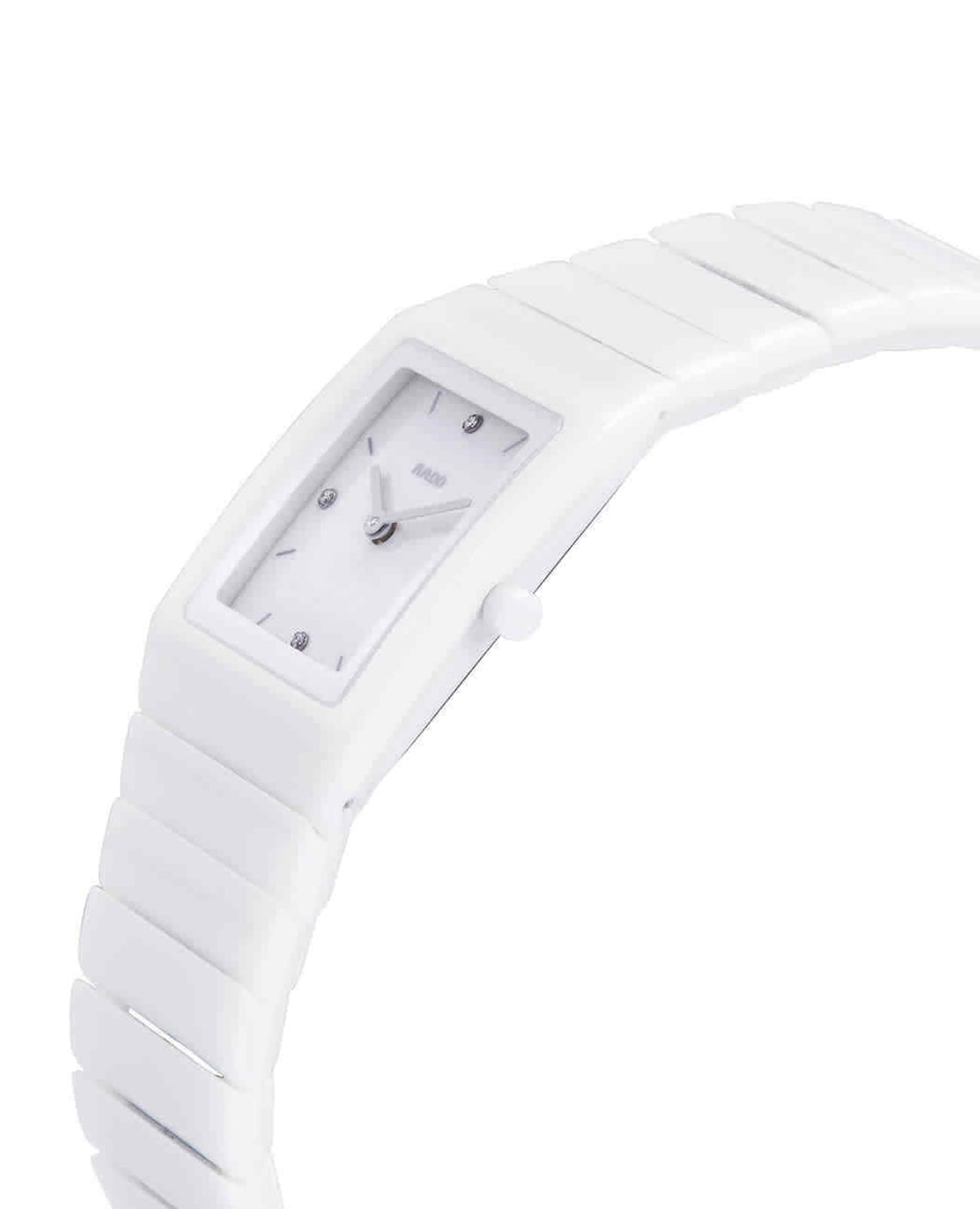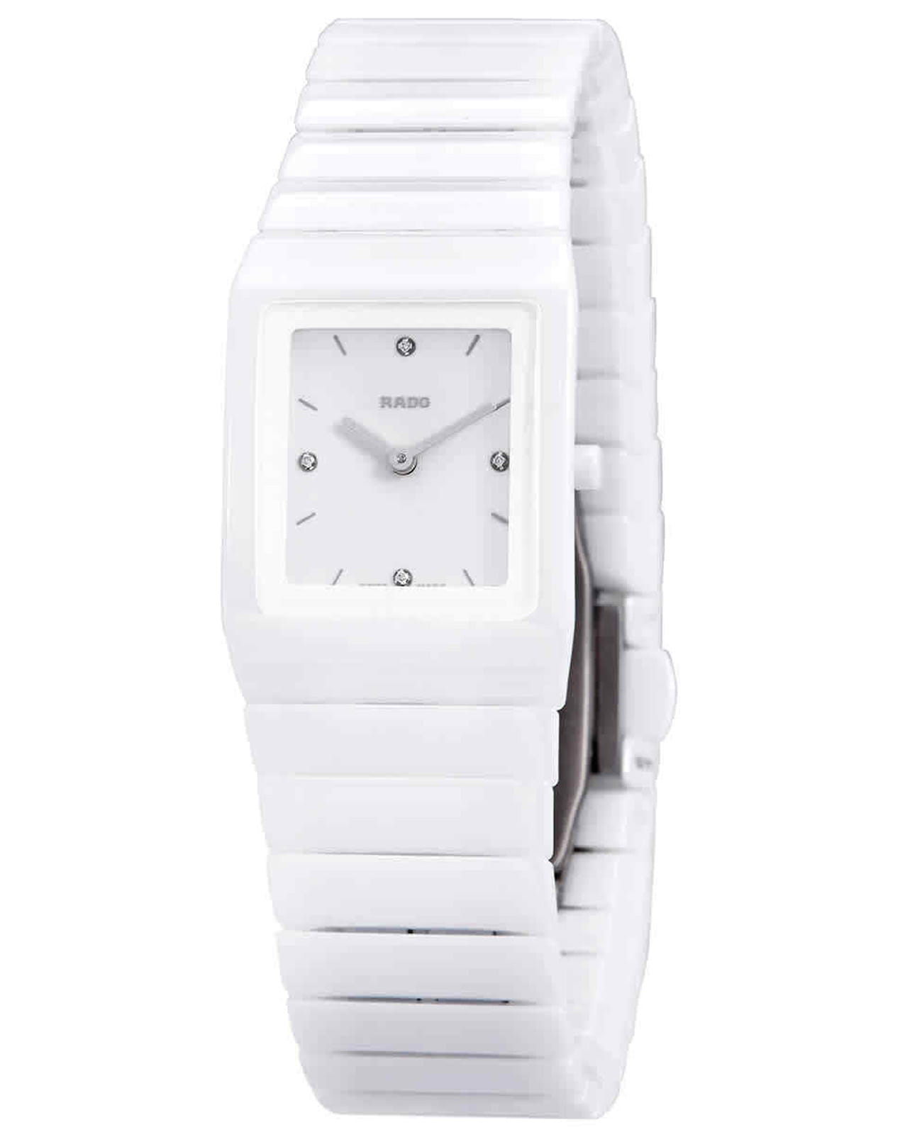 Швейцарские женские Rado Ceramica R21703712, кварцевый механизм с высокой точностью. Сапфировое стеклоСапфировое стеклоПрочный и надёжный материал из кристалла сапфира синтетического происхождения, характеризующийся особой твёрдостью и устойчивостью к царапинам и повреждениям. устойчивое к появлению царапин, обладающее высокой прозрачностью. Корпус часов изготовлен из высокотехнологичной керамикиВысокотехнологичная керамикаИнновационный запатентованный Rado материал с гладкой или матовой поверхностью. Керамика за счёт кристаллической структуры обладает повышенной устойчивостью от возникновения царапин. Материал способен принимать температуру тела человека, обеспечивая невероятный комфорт при ношении.. Циферблат украшен бриллиантами. Класс водозащиты: 30 метров, позволит защитить корпус от случайных брызг или капель дождя. Керамический браслет на застёжке-бабочке с кнопкамиЗастёжка "бабочка"Такой вид застёжки дополняется предохранителями, помогающими избежать случайного раскрытия браслета. Обладают изящным исполнением. .