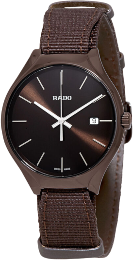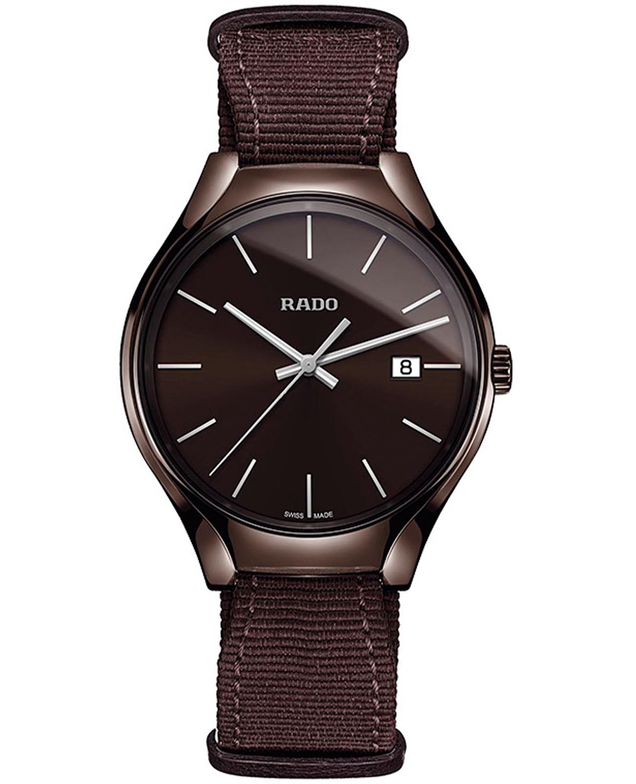 Мужские кварцевые швейцарские часы Rado True R27234306. Корпус часов изготовлен из высокотехнологичной керамикиВысокотехнологичная керамикаИнновационный запатентованный Rado материал с гладкой или матовой поверхностью. Керамика за счёт кристаллической структуры обладает повышенной устойчивостью от возникновения царапин. Материал способен принимать температуру тела человека, обеспечивая невероятный комфорт при ношении.. Тканевый ремешок на стандартной застёжке. Сапфировое стеклоСапфировое стеклоПрочный и надёжный материал из кристалла сапфира синтетического происхождения, характеризующийся особой твёрдостью и устойчивостью к царапинам и повреждениям. устойчивое к мелким механическим повреждениям. Класс водозащиты: 50 метров, позволит защитить корпус от случайных брызг или капель дождя. Окошко даты находится в положении 3 часа.