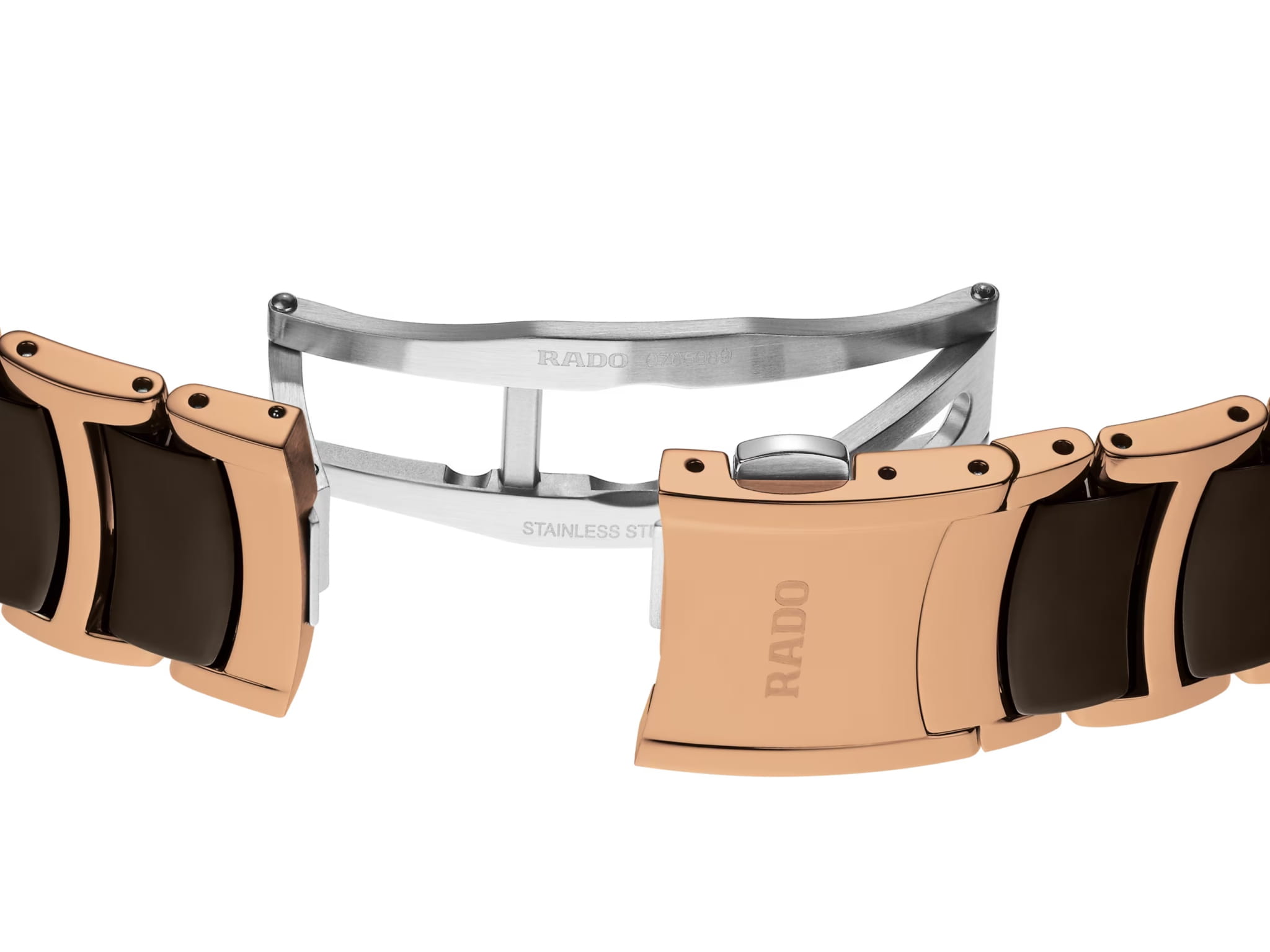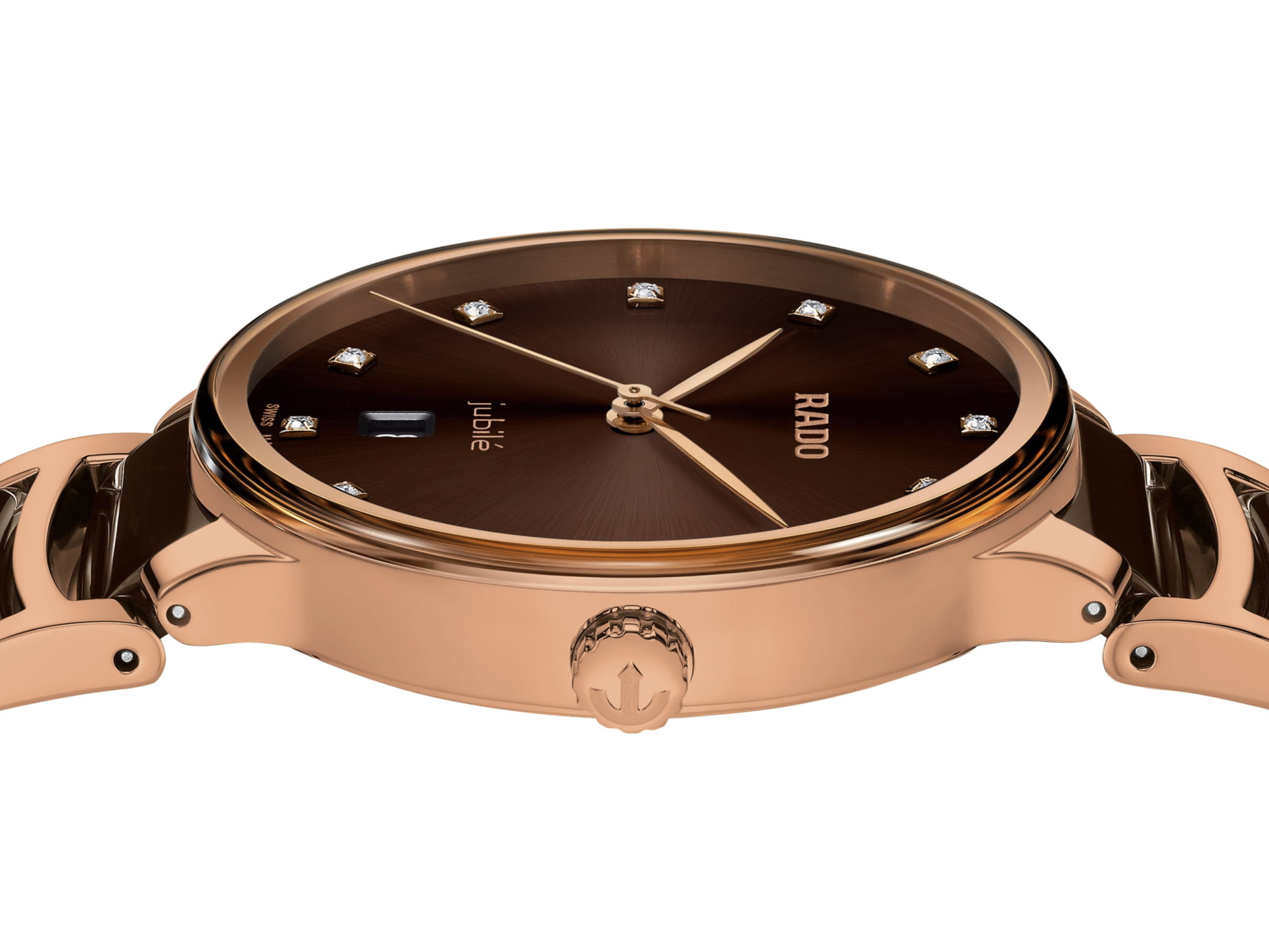 Швейцарские часы с надёжным кварцевым механизмом Rado Centrix Diamonds R30023732. Корпус часов изготовлен из нержавеющей стали. Браслет из стали и высокотехнологичной керамикиВысокотехнологичная керамикаИнновационный запатентованный Rado материал с гладкой или матовой поверхностью. Керамика за счёт кристаллической структуры обладает повышенной устойчивостью от возникновения царапин. Материал способен принимать температуру тела человека, обеспечивая невероятный комфорт при ношении. на раскладной застёжкеРаскладная застёжкаТакой тип застёжки используется только на браслетах из металла. Она никогда не раскрывается полностью, происходит разделение на 2 и более частей. Раскладывающая застёжка снизит вероятность потери часов к минимуму.. Сапфировое стеклоСапфировое стеклоПрочный и надёжный материал из кристалла сапфира синтетического происхождения, характеризующийся особой твёрдостью и устойчивостью к царапинам и повреждениям. устойчивое к мелким механическим повреждениям. Класс водозащиты: 50 метров, позволит защитить корпус от случайных брызг или капель дождя. Окошко даты находится в положении 6 часов. Циферблат инкрустирован бриллантами.