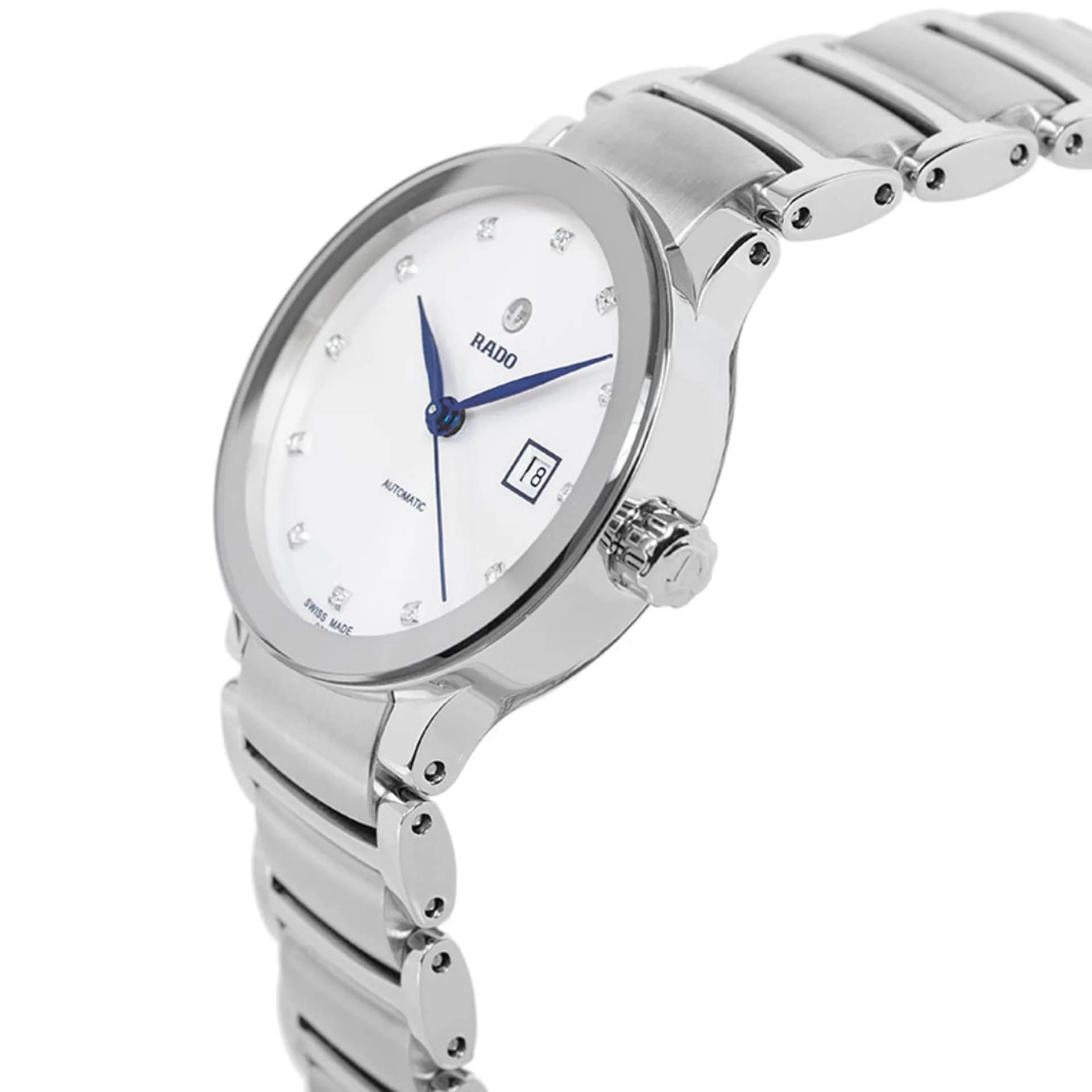 Швейцарские женские механические часы с автоподзаводом Rado Centrix Automatic Diamonds R30027733. Корпус часов изготовлен из стали. Браслет из стали на раскладной застёжкеРаскладная застёжкаТакой тип застёжки используется только на браслетах из металла. Она никогда не раскрывается полностью, происходит разделение на 2 и более частей. Раскладывающая застёжка снизит вероятность потери часов к минимуму.. Сапфировое стеклоСапфировое стеклоПрочный и надёжный материал из кристалла сапфира синтетического происхождения, характеризующийся особой твёрдостью и устойчивостью к царапинам и повреждениям. устойчивое к мелким механическим повреждениям. Класс водозащиты: 30 метров, позволит защитить корпус от случайных брызг или капель дождя. Окошко даты находится в положении 3 часа. Циферблат инкрустирован бриллиантами.