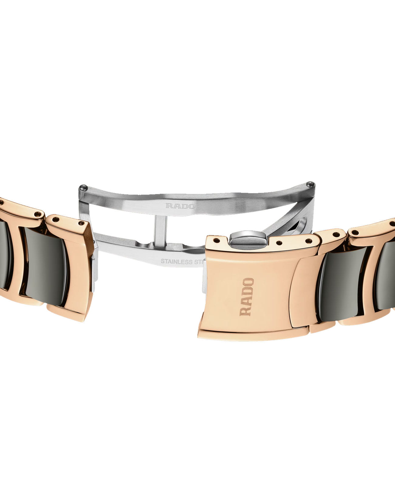 Женские механические швейцарские часы-скелетоны Rado Centrix Automatic Diamonds Open Heart R30028912 из коллекции Rado Centrix отражают собой часовое искусство в премиальном исполнении. Сапфировое стеклоСапфировое стеклоПрочный и надёжный материал из кристалла сапфира синтетического происхождения, характеризующийся особой твёрдостью и устойчивостью к царапинам и повреждениям. устойчивое к мелким механическим повреждениям. Корпус часов изготовлен из нержавеющей стали с PVD-покрытиемPVDУльтратонкое покрытие наносится в технике вакуумного напыления, сочетает в себе нитрид титана особой прочности со слоем золота или оксида хрома. Несёт в себе декоративную или защитную функцию.. Скелетонизированный циферблат инкрустирован бриллиантами. Класс водозащиты: 50 метров, позволит защитить корпус от случайных брызг или капель дождя. Браслет из стали и высокотехнологичной керамикиВысокотехнологичная керамикаИнновационный запатентованный Rado материал с гладкой или матовой поверхностью. Керамика за счёт кристаллической структуры обладает повышенной устойчивостью от возникновения царапин. Материал способен принимать температуру тела человека, обеспечивая невероятный комфорт при ношении. на раскладной застёжкеРаскладная застёжкаТакой тип застёжки используется только на браслетах из металла. Она никогда не раскрывается полностью, происходит разделение на 2 и более частей. Раскладывающая застёжка снизит вероятность потери часов к минимуму..
