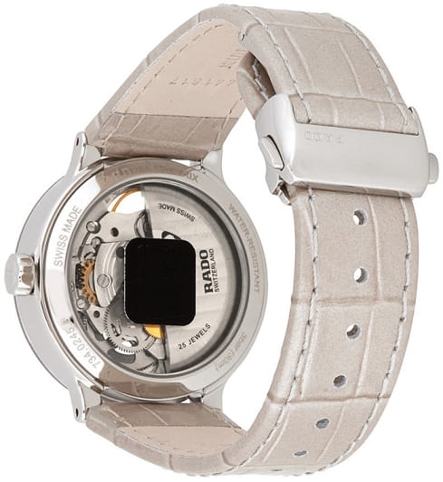 Женские механические швейцарские часы-скелетоны Rado Centrix Automatic Diamonds Open Heart R30245905 из коллекции Rado Centrix отражают собой часовое искусство в премиальном исполнении. Сапфировое стеклоСапфировое стеклоПрочный и надёжный материал из кристалла сапфира синтетического происхождения, характеризующийся особой твёрдостью и устойчивостью к царапинам и повреждениям. устойчивое к мелким механическим повреждениям. Корпус часов изготовлен из нержавеющей стали с PVD-покрытиемPVDУльтратонкое покрытие наносится в технике вакуумного напыления, сочетает в себе нитрид титана особой прочности со слоем золота или оксида хрома. Несёт в себе декоративную или защитную функцию.. Скелетонизированный циферблат инкрустирован бриллиантами. Класс водозащиты: 50 метров, позволит защитить корпус от случайных брызг или капель дождя. Кожаный ремешок на раскладной застёжкеРаскладная застёжкаТакой тип застёжки используется только на браслетах из металла. Она никогда не раскрывается полностью, происходит разделение на 2 и более частей. Раскладывающая застёжка снизит вероятность потери часов к минимуму..