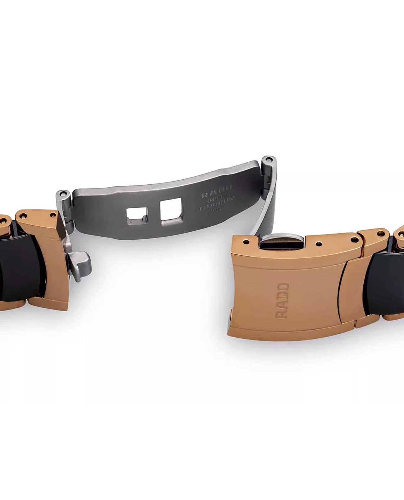Аксессуар в чёрно-золотом цвете всегда будет иметь актуальность, он представляет собой эталон классики. Строгий деловой костюм, дополненный часами Rado со вставками из высокотехнологичной керамикиВысокотехнологичная керамикаИнновационный запатентованный Rado материал с гладкой или матовой поверхностью. Керамика за счёт кристаллической структуры обладает повышенной устойчивостью от возникновения царапин. Материал способен принимать температуру тела человека, обеспечивая невероятный комфорт при ношении. на браслете, поможет создать образ делового и солидного человека. Скелетонизированная задняя крышка. Корпус из хирургической стали 316L. PVD-финишPVDУльтратонкое покрытие наносится в технике вакуумного напыления, сочетает в себе нитрид титана особой прочности со слоем золота или оксида хрома. Несёт в себе декоративную или защитную функцию. цвета розового золота. Сапфировое стекло. Прямоугольное окошко даты. Диаметр корпуса: 38 мм.