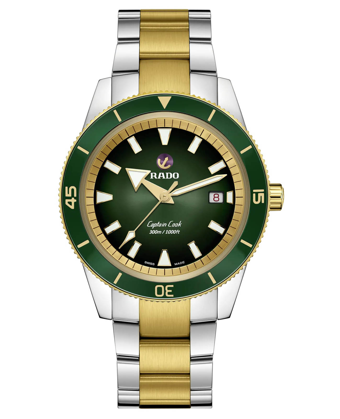 Эти 42-миллиметровые часы Captain Cook Automatic поставляются с лакированным зелено-черным градиентным циферблатом, который идеально сочетается с браслетом из нержавеющей стали с PVD-покрытиемPVDУльтратонкое покрытие наносится в технике вакуумного напыления, сочетает в себе нитрид титана особой прочности со слоем золота или оксида хрома. Несёт в себе декоративную или защитную функцию. цвета розового золота. Стрелки и индексы с люминесцентным покрытиемЛюминесцентное покрытиеПозволяет считывать показания времени в темноте. Производители наносят на стрелки, часовые индексы, безель или поверхность циферблата светонакопительный состав, дающий холодное свечение. Super-LumiNova® обеспечивают отличную видимость. Для более высокой точности автоматическое перемещение Rado R763 внутри превышает стандартные требования к проверке точности с 3 до 5 позиций. Полированный корпус из нержавеющей стали с сапфировым стекломСапфировое стеклоПрочный и надёжный материал из кристалла сапфира синтетического происхождения, характеризующийся особой твёрдостью и устойчивостью к царапинам и повреждениям. в форме коробки обеспечивает уникальный эффект «пузыря» для выдающегося внешнего вида. Система EasyClip позволяет быстро и легко менять ремешки для настройки часов и персонализации стиля.