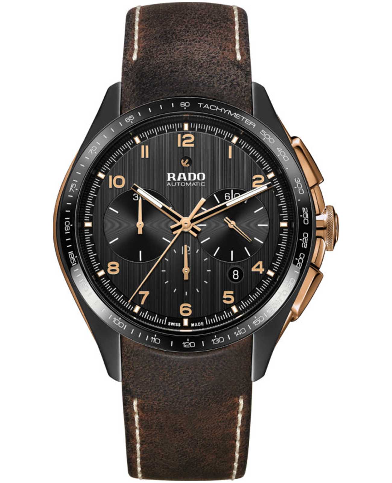 Мужские швейцарские часы-хронографХронографФункция позволяет измерять отрезки времени с особой точностью: часы, минуты, секунды. Верным признаком хронографа является наличие на циферблате 3 дополнительных окошек-счётчиков. Rado HyperChrome Automatic Chronograph R32503166. Корпус часов изготовлен из нержавеющей стали с PVD-покрытиемPVDУльтратонкое покрытие наносится в технике вакуумного напыления, сочетает в себе нитрид титана особой прочности со слоем золота или оксида хрома. Несёт в себе декоративную или защитную функцию. и высокотехнологичной керамикиВысокотехнологичная керамикаИнновационный запатентованный Rado материал с гладкой или матовой поверхностью. Керамика за счёт кристаллической структуры обладает повышенной устойчивостью от возникновения царапин. Материал способен принимать температуру тела человека, обеспечивая невероятный комфорт при ношении.. Сапфировое стеклоСапфировое стеклоПрочный и надёжный материал из кристалла сапфира синтетического происхождения, характеризующийся особой твёрдостью и устойчивостью к царапинам и повреждениям. устойчивое к мелким механическим повреждениям. БезельБезельВнешний ободок, закрепляющий стекло. В спортивных часах так называется поворотное кольцо с делениями на циферблате, выполняет роль таймера – замеряет отрезки времени на шкале. Неподвижный безель – элемент декора. Однонаправленно вращающийся безель на дайверских часах позволяет фиксировать моменты погружения и выныривания на поверхность. со шкалой тахиметраТахиметрРазмеченная шкала, располагается на ободке или безеле часов. Тахиметр позволяет рассчитать скорость на определённом участке пути, расстояние измеряется в километрах или милях.. Стрелки и метки с люминесцентным покрытиемЛюминесцентное покрытиеПозволяет считывать показания времени в темноте. Производители наносят на стрелки, часовые индексы, безель или поверхность циферблата светонакопительный состав, дающий холодное свечение.. Окошко даты находится в положении между 4 и 5 часов. Класс водозащиты: 100 метров, позволит плавать, нырять и заниматься другими водными видами спорта. Кожаный ремешок на раскладной застёжкеРаскладная застёжкаТакой тип застёжки используется только на браслетах из металла. Она никогда не раскрывается полностью, происходит разделение на 2 и более частей. Раскладывающая застёжка снизит вероятность потери часов к минимуму..