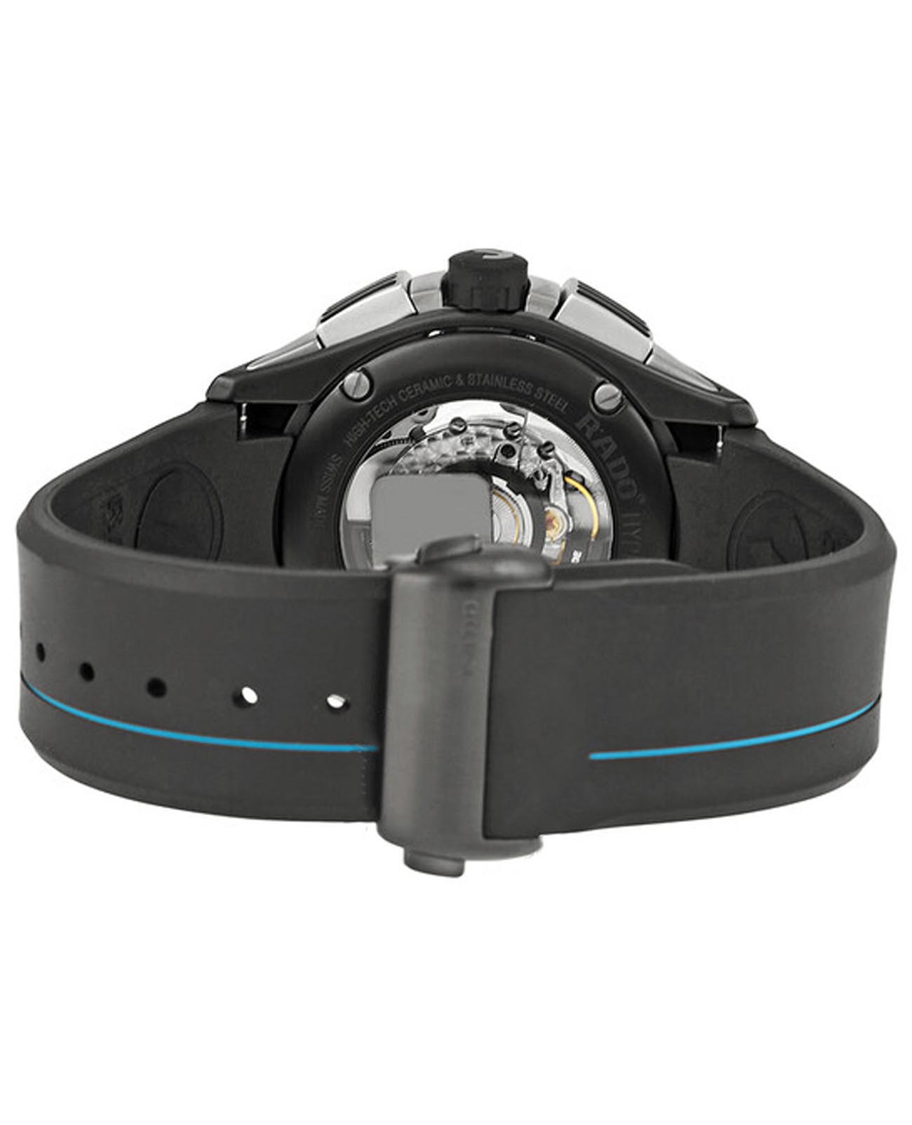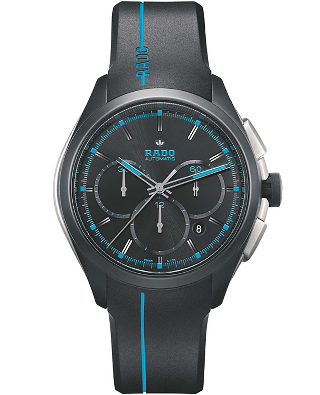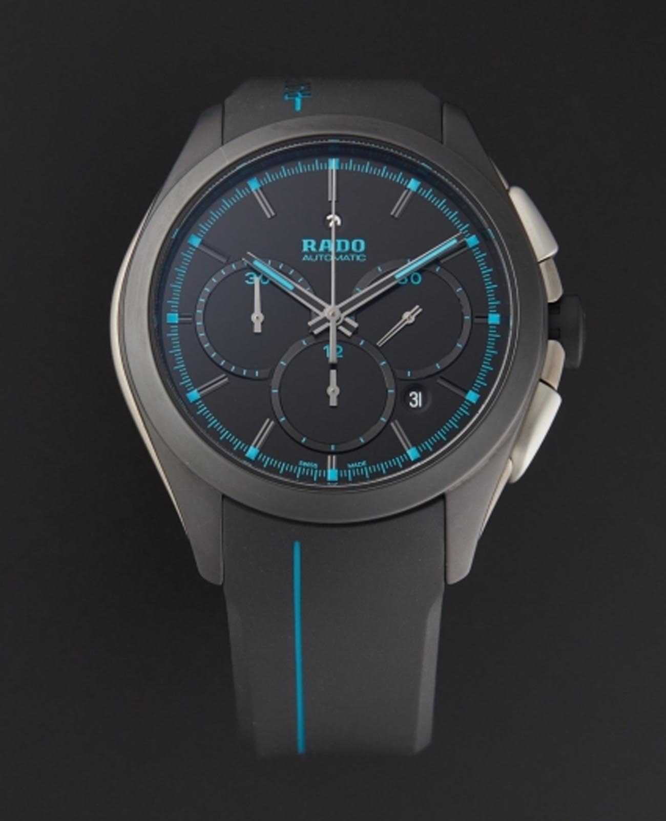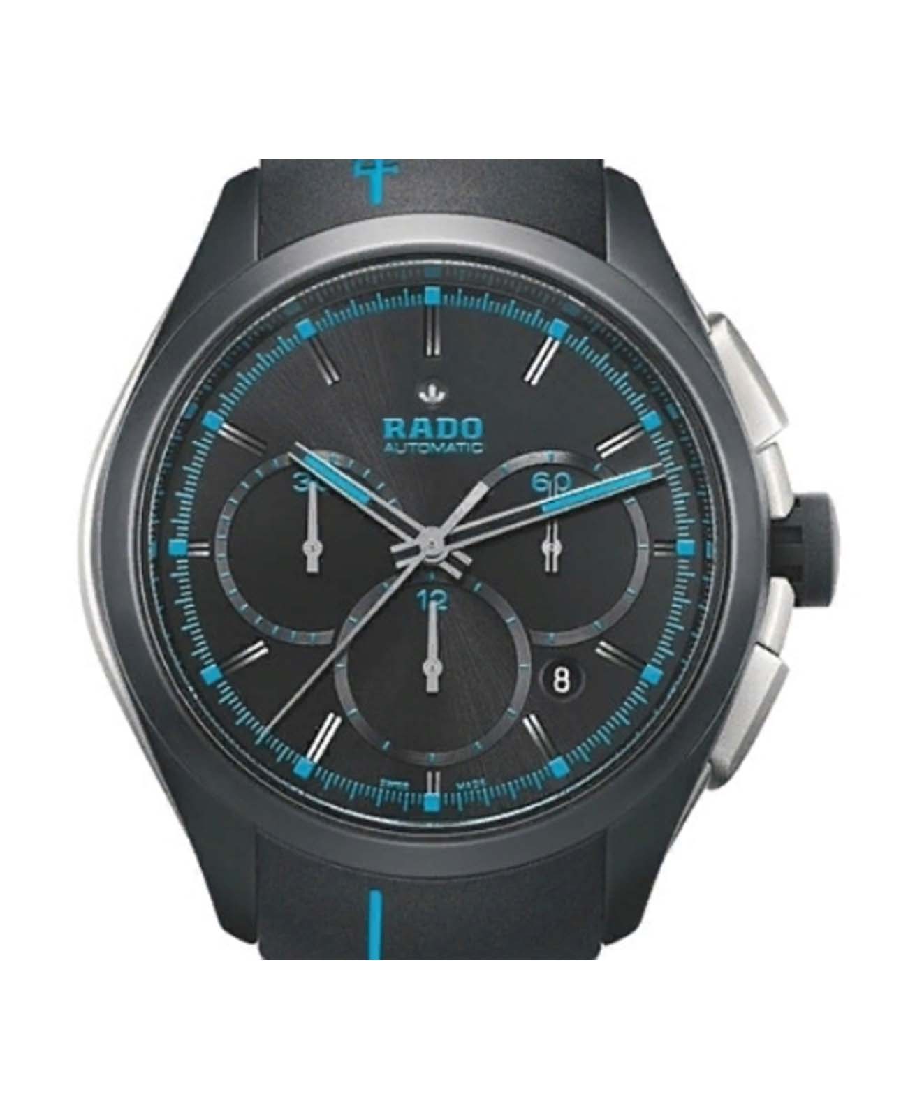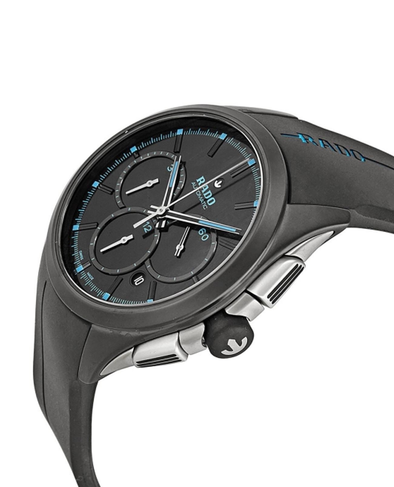 Мужские механические швейцарские часы- хронографХронографФункция позволяет измерять отрезки времени с особой точностью: часы, минуты, секунды. Верным признаком хронографа является наличие на циферблате 3 дополнительных окошек-счётчиков. с автоподзаводом Rado HyperChrome Automatic Chronograph R32525159. Сапфировое стеклоСапфировое стеклоПрочный и надёжный материал из кристалла сапфира синтетического происхождения, характеризующийся особой твёрдостью и устойчивостью к царапинам и повреждениям. устойчивое к мелким механическим повреждениям. Корпус часов изготовлен из высокотехнологичной керамикиВысокотехнологичная керамикаИнновационный запатентованный Rado материал с гладкой или матовой поверхностью. Керамика за счёт кристаллической структуры обладает повышенной устойчивостью от возникновения царапин. Материал способен принимать температуру тела человека, обеспечивая невероятный комфорт при ношении.. Окошко даты находится в положении между 4 и 5 часами. Стрелки с люминесцентным покрытиемЛюминесцентное покрытиеПозволяет считывать показания времени в темноте. Производители наносят на стрелки, часовые индексы, безель или поверхность циферблата светонакопительный состав, дающий холодное свечение.. Класс водозащиты: 100 метров, позволит плавать, нырять и заниматься другими водными видами спорта. Каучуковый ремешок на раскладной застёжкеРаскладная застёжкаТакой тип застёжки используется только на браслетах из металла. Она никогда не раскрывается полностью, происходит разделение на 2 и более частей. Раскладывающая застёжка снизит вероятность потери часов к минимуму..