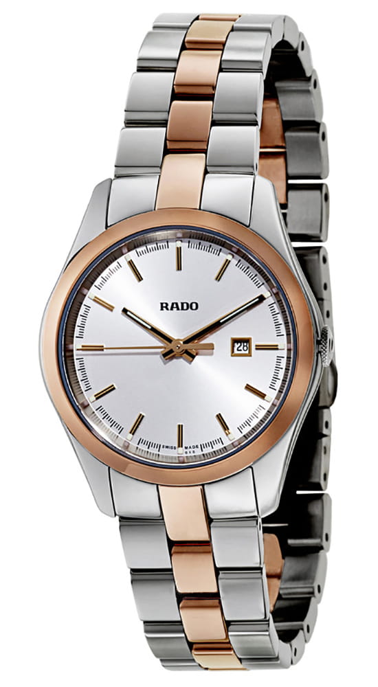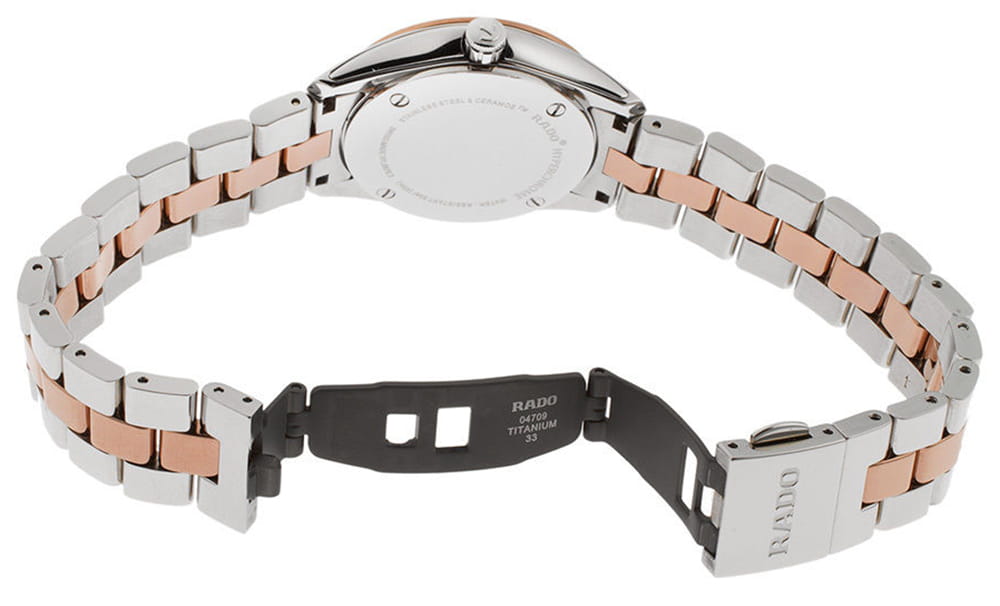 Женские швейцарские часы с надёжным кварцевым механизмом Rado Hyperchrome R32976102. Сапфировое стеклоСапфировое стеклоПрочный и надёжный материал из кристалла сапфира синтетического происхождения, характеризующийся особой твёрдостью и устойчивостью к царапинам и повреждениям. устойчивое к мелким механическим повреждениям. Корпус часов изготовлены из нержавеющей стали. Стальной браслет с CeramosCeramosМатериал являет собой инновационное сочетание высокотехнологичной керамики и сплава металла. Он объединяет керамическую устойчивость к царапинам и металлический роскошный блеск. на раскладной застёжкеРаскладная застёжкаТакой тип застёжки используется только на браслетах из металла. Она никогда не раскрывается полностью, происходит разделение на 2 и более частей. Раскладывающая застёжка снизит вероятность потери часов к минимуму.. Окошко даты находится в положении 3 часа. Стрелки с люминесцентным покрытиемЛюминесцентное покрытиеПозволяет считывать показания времени в темноте. Производители наносят на стрелки, часовые индексы, безель или поверхность циферблата светонакопительный состав, дающий холодное свечение.. Класс водозащиты: 50 метров, позволит защитить корпус от случайных брызг или капель дождя. БезельБезельВнешний ободок, закрепляющий стекло. В спортивных часах так называется поворотное кольцо с делениями на циферблате, выполняет роль таймера – замеряет отрезки времени на шкале. Неподвижный безель – элемент декора. Однонаправленно вращающийся безель на дайверских часах позволяет фиксировать моменты погружения и выныривания на поверхность. с CeramosCeramosМатериал являет собой инновационное сочетание высокотехнологичной керамики и сплава металла. Он объединяет керамическую устойчивость к царапинам и металлический роскошный блеск. .