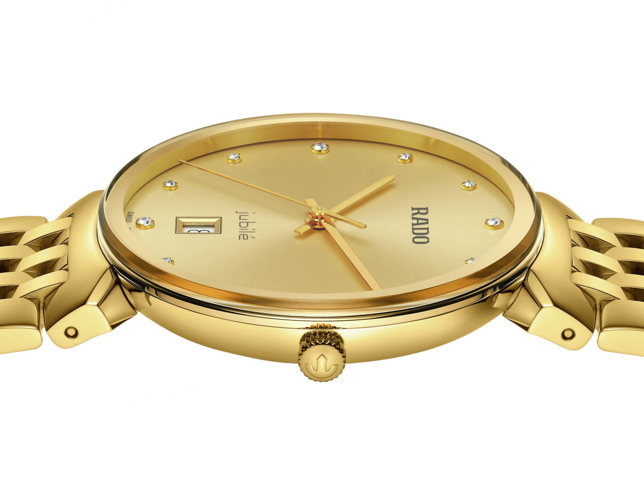 Швейцарские наручные часы с надёжным кварцевым механизмом Rado Florence Diamonds R48914713. Корпус и браслет часов изготовлены из нержавеющей стали с PVD-покрытиемPVDУльтратонкое покрытие наносится в технике вакуумного напыления, сочетает в себе нитрид титана особой прочности со слоем золота или оксида хрома. Несёт в себе декоративную или защитную функцию.. Сапфировое стеклоСапфировое стеклоПрочный и надёжный материал из кристалла сапфира синтетического происхождения, характеризующийся особой твёрдостью и устойчивостью к царапинам и повреждениям. с антибликовым покрытиемАнтибликовое покрытиеСлой оксида металла в 0,13-0,3 микрон, благодаря которому стекло часов не бликует и не отражает свет. Антибликовое покрытие уменьшает отражение света в 10 раз, обеспечивая отличную читаемость показателей циферблата., устойчивое к мелким механическим повреждениям. Стальной браслет на застёжке-бабочке с кнопкамиЗастёжка "бабочка"Такой вид застёжки дополняется предохранителями, помогающими избежать случайного раскрытия браслета. Обладают изящным исполнением. . Класс водозащиты: 50 метров, позволит защитить корпус от случайных брызг или капель дождя. Окошко даты находится в положении 6 часов.. Циферблат инкрустирован бриллиантами.